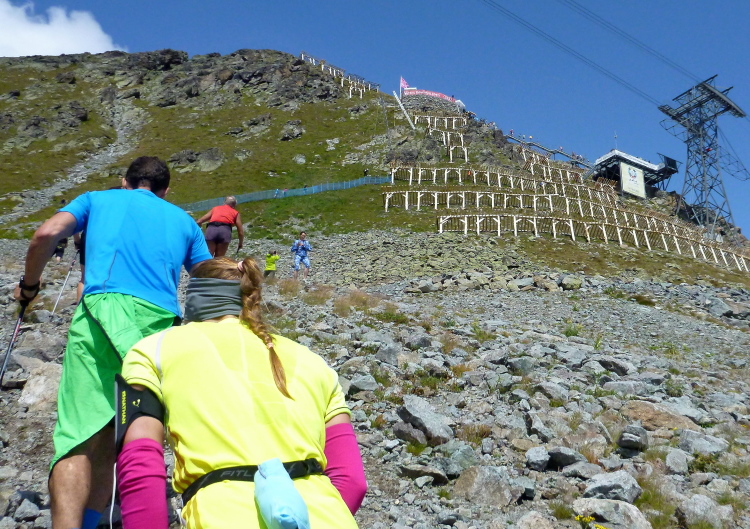 Ausrüstung: Man macht uns eindringlich klar, dass das Ziel im hochalpinen Gelände auf ca. 2.700 Metern ist, die Rennbekleidung sollte dementsprechend ausgewählt und dem Wetter angepasst werden (Langärmliges Oberteil und knielange Shorts oder Tights). Das Mitführen einer Regenjacke ist obligatorisch. Mütze, Stirnband und Handschuhe werden empfohlen. Stöcke sind erlaubt. Was sehe ich am Ziel, nachdem ich bei durchaus brauchbarem Wetter erfahren habe, daß Plan B nicht gezogen werden muß? Mädels bauchfrei, in knappsten Hosen (fürs Auge durchaus gefällig), Jungs in ganz Kurz, und ich? Kompressionsstrümpfe, Dreiviertelhose, Langarmshirt, Weste, Buff, leichte Mütze, Rucksack mit Jacke – und ich schwitze. Machen wir es kurz: Einige hundert Höhenmeter weiter im kühlen Wind bereits weiß ich, daß ich – zumindest in meiner Preisklasse - genau richtig gekleidet bin.