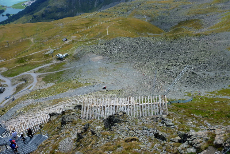 Mit dem „Vertical Sommerlauf“ wird es beim flachen Engadiner Sommerlauf in den Schweizer Alpen doch noch steil. Die 5,5 km kurze Strecke führt aus der Fußgängerzone von St. Moritz Dorf über die Treppen in Richtung Salastrains, wo auf die Strecke der Herrenabfahrt gewechselt wird. Als Leckerbissen macht der „Freie Fall“ den Abschluß der Strecke, bevor nach knapp 1.000 Höhenmetern die Plattform auf 2.840 m ü.M. entlang der Seilbahn von der Corviglia auf den Piz Nair erreicht wird. Wow! Beim „Freien Fall“ handelt es sich übrigens um den steilsten Start aller Herrenskiabfahrten. Im Winter stürzen sich die Wahnsinnigen hier praktisch senkrecht in die Tiefe und beschleunigen in sechs Sekunden auf bis zu 140 Kilometer pro Stunde. Mich beschleicht die dunkle Ahnung, daß es für mich in umgekehrter Richtung nicht ganz so flott gehen wird.