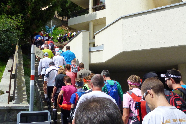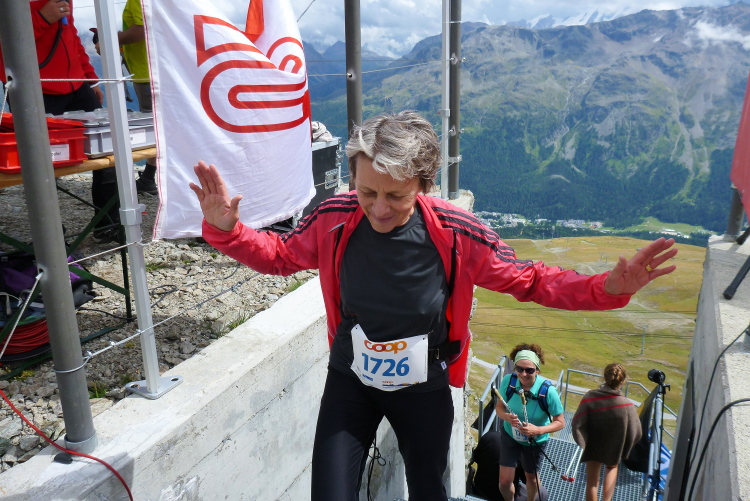 Immer weiter geht es bergauf, km 4,0 ist erreicht und ich komme tatsächlich noch mal für rund hundert Meter ins Laufen. Das gleiche erneut bei km 4,4 und 4,7. Erfreulicherweise sind immer wieder Fans auf der Strecke, und das sowohl zwei- als auch vierbeinige. Dann sehe und höre ich gleichzeitig etwas extrem Angenehmes: Das Ziel samt lautstarker Moderation! Oben rechts kann ich die Lawinenverbauung erkennen und auch schon die finalen Stahltreppen. Wolfgang aus unserem Hotel kann ich überholen sowie motivieren und freue mich über die Anfeuerung von Ricarda Bethke und Jens Vieler, die ich schon am Start getroffen hatte, und mit denen ich morgen die 25,2 km des Engadiner Sommerlaufs von Sils nach Samedan unter die Füße nehmen werde.