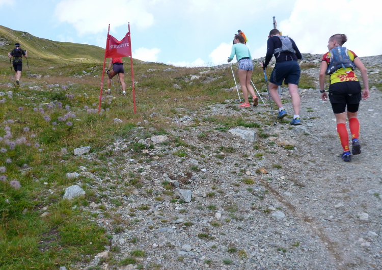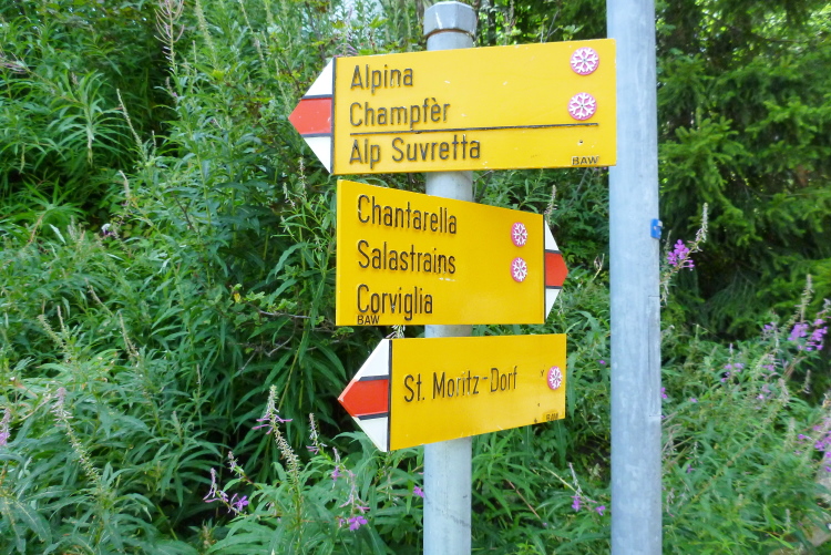 Nach einigen Häusern endet die Asphaltphase und wir wechseln auf einen Kiesweg. Schön ist zu erkennen, daß man uns den Parcours passend mit (ich weiß gar nicht, wie man die genau nennt) Slalom- bzw. Riesenslalomtoren, also zwei Stangen, die mit einem Stofftuch verbunden sind, markiert hat. „St. Moritz“ steht darauf, sehr schön, das gefällt mir. Vorbei am Hotel Salastrains sagen wir der Zivilisation Ade. Die letzten 1,5 km konnte ich einigermaßen laufen, jetzt, nach 2,2 km, ist damit fast bis zum Gipfel Schluß. Wir arbeiten uns einen Hang hinauf, aber was für einen! Man sagte uns am Start, uns würde eine bis zu 75%ige Steigung erwarten und ich glaube, es ist soweit.