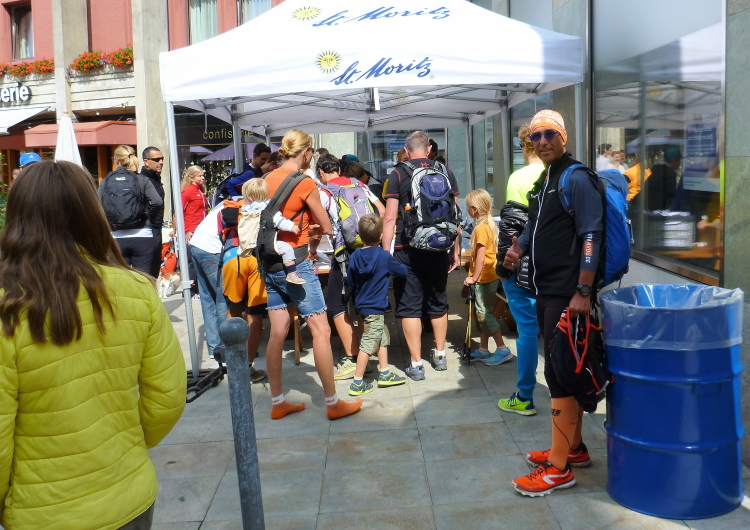 Startnummernausgabe und Start befinden sich an markanter Stelle in der Fußgängerzone von St. Moritz Dorf. Sowohl die An- als auch die Nachmeldelage können die Veranstalter kaum glauben, wie ich mehrfach höre. Mit dreißig bis vierzig Teilnehmern hatte man anfangs geplant, gemeldet hatten schließlich 237, von denen 216 im Ziel erschienen. Der „Effektenbus“, also der Kleintransporter, der die Wechselkleidung zur Gondel fuhr, hätte vielleicht noch fünf Rucksäcke aufnehmen können. Wahnsinn.