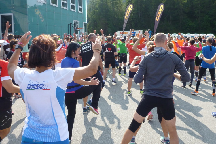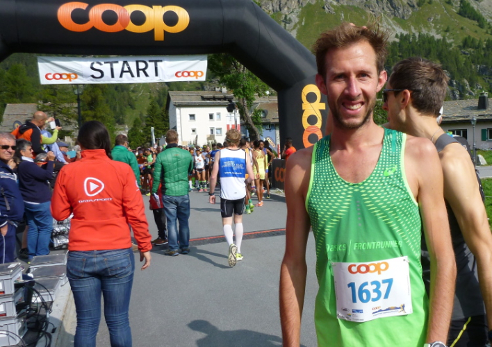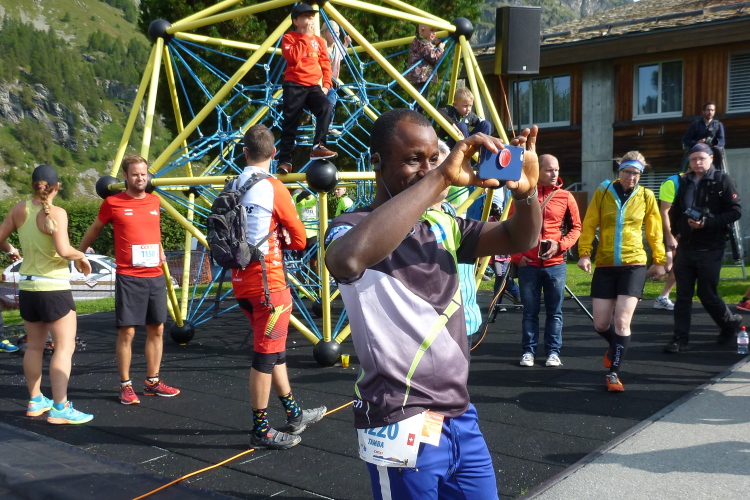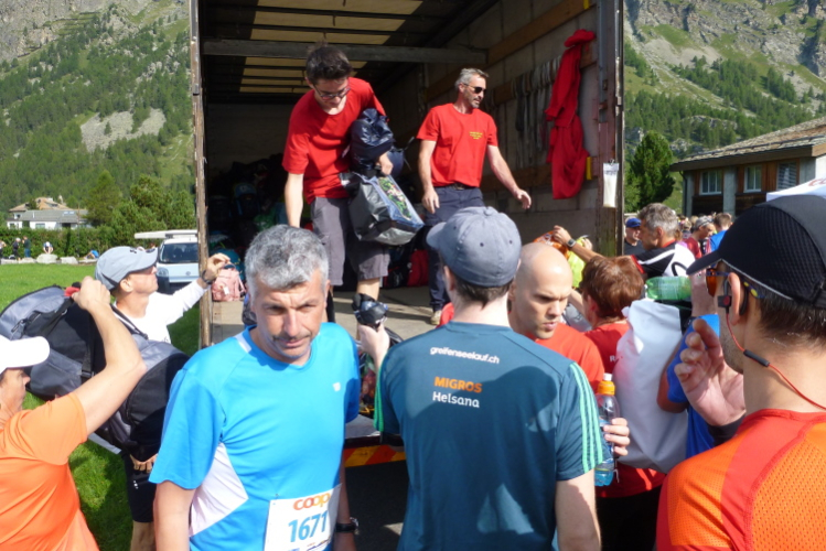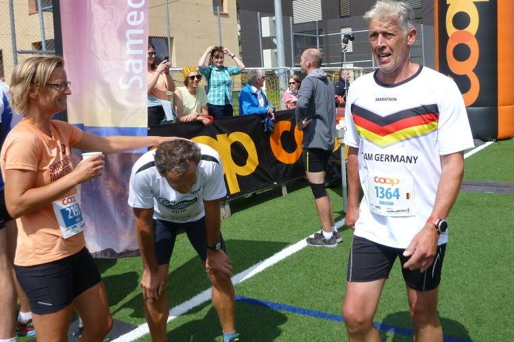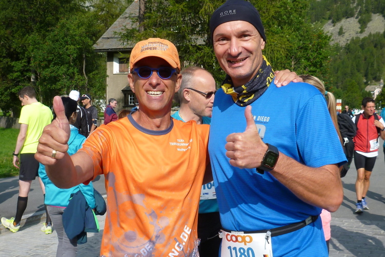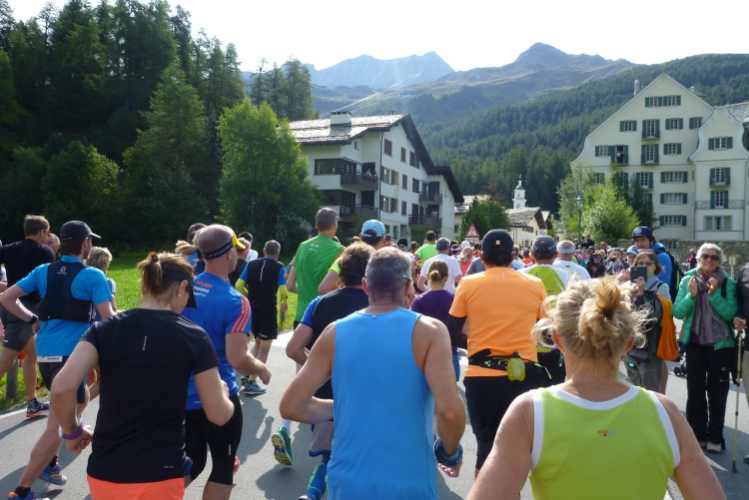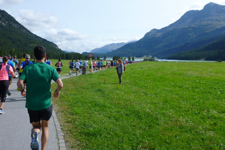 Knackig kalt ist es morgens noch, bei erfrischenden vier Grad machen wir uns in Surlej auf die Socken und in Sils ist es im Schatten kaum wärmer. Jedoch strahlt die Sonne bereits vom Firmament und heizt so ausreichend ein, daß die Anzugsordnung nur „Kurz“ lauten kann. Zudem bringt Kathrin als Animateurin von der Bühne aus alle Bewegungswilligen auf Betriebstemperatur und so die noch etwas müden Glieder in Schwung. Die Wechselkleidung geben wir vor dem Start an einem Lkw ab und bewundern noch kurz die sich einlaufenden schwarzen Gazellen. Auch Simon Stützel ist dabei, mit dem ich mehrere Jahre im gleichen Verein war und der mit einer Marathon-PB von 2:17 Std. kurzfristig nachgemeldet hat. Mit zehn Minuten Rückstand wird er einen soliden 13. Platz belegen. Die unverwüstliche Renate Werz verlegt sich in höherem Alter zunehmend auf kürzere Strecken und strahlt mit der Sonne um die Wette.