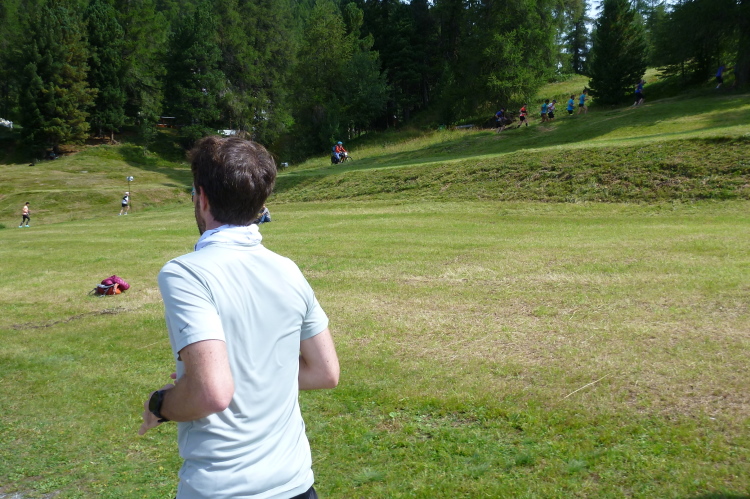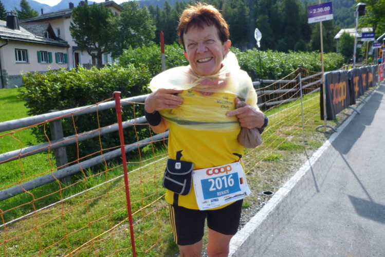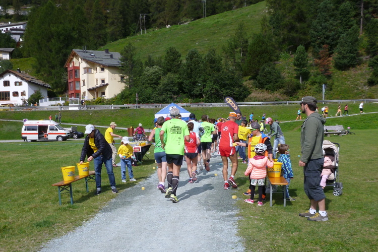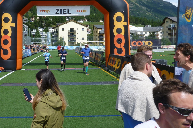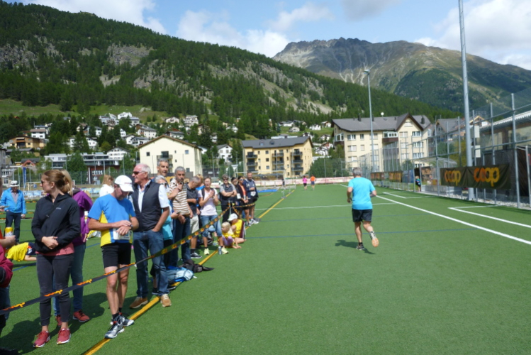 Eingangs des Sportplatzes mit Kunstrasen steht eine mir bekannte, mobile, aus einer Person bestehende Fangruppe, die zum Amusement der Umstehenden von mir natürlich gebührend begrüßt wird. So viel Zeit muß schließlich sein. Eine halbe Ehrenrunde später ist der 38. Engadiner Sommerlauf leider – wirklich! – für mich nach 2:23 Std. Geschichte. Es gibt zwar eine gute Zielverpflegung, nicht jedoch das versprochene T-Shirt. Warum nicht? Schon bei der Anmeldung teilte man uns mit, daß die komplette Lieferung gestohlen worden sei, aber man wird uns aufgrund einer Neuanfertigung im November ein schönes Adventsgeschenk bereiten. In jeder Hinsicht ist das für die Organisatoren höchst ärgerlich und kostenintensiv.