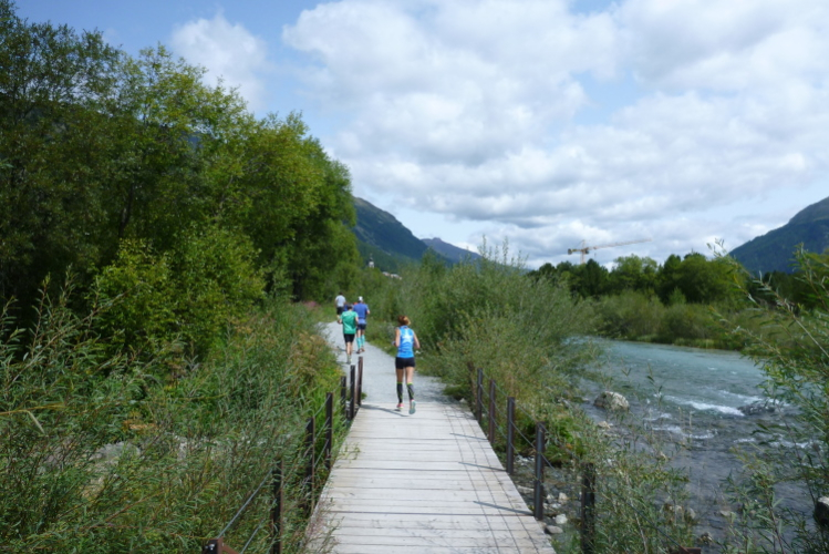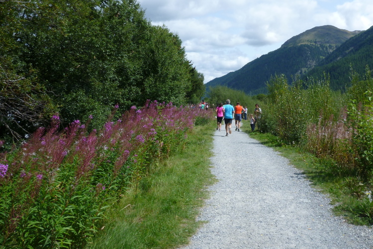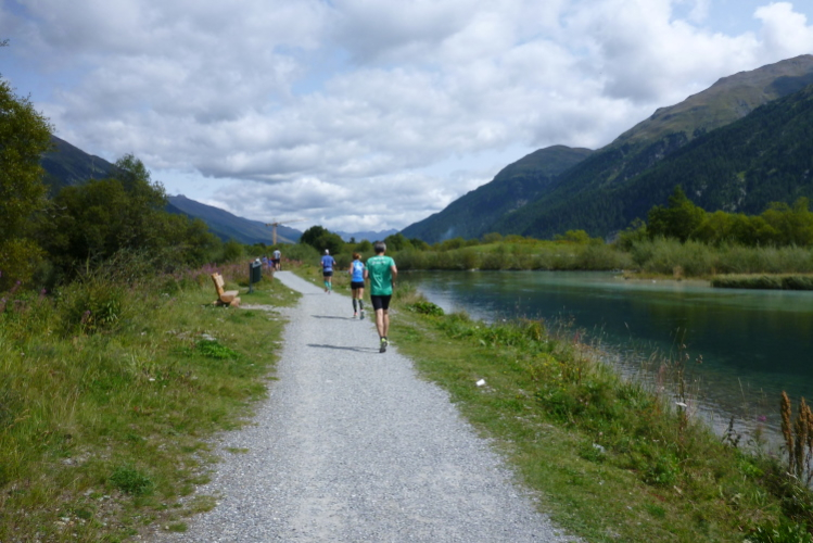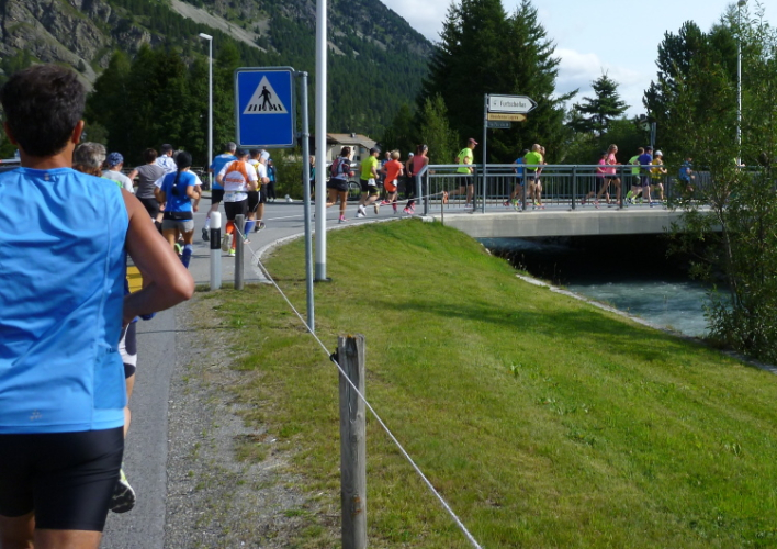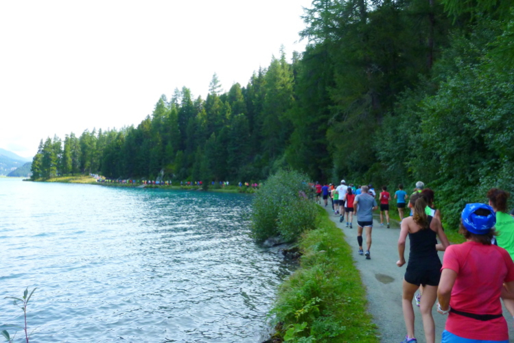 Auf Los geht’s los und nach ein paar Startfotos reihe auch ich mich ein, aber nicht ohne die Startmatte wegen der Netto-Zeiterfassung zu versäumen. Durch eine Straße mit hübschen Häusern führt der Weg schnell am Flüsschen Fedacla an den Silvaplanerseee, den wir unmittelbar am Wasser auf einem gut zu belaufenden Kiesweg begleiten. Toll, genauso habe ich mir das heute vorgestellt. Schnell zieht sich das Feld auseinander und in meinem Abschnitt kann jeder unbedrängt seinem Vorwärtsdrang nachgeben. Beruhigt stelle ich fest, daß mir der gestrige Vertical Sommerlauf (Bericht auf trailrunning.de) in keiner Weise nachhängt und die Haxen brav, ohne zu maulen, ihren Dienst verrichten. Herrlich ist auch immer wieder der Blick zurück: Läufer am Wasser vor blauem Himmel und hohen Bergen. Das Leben ist schön.