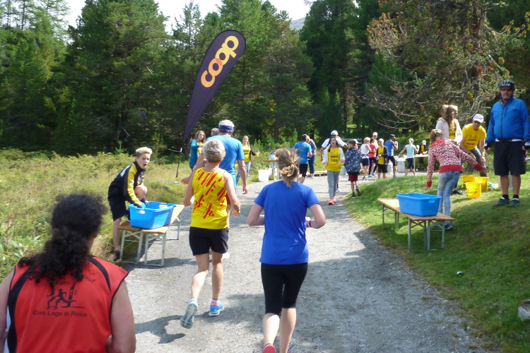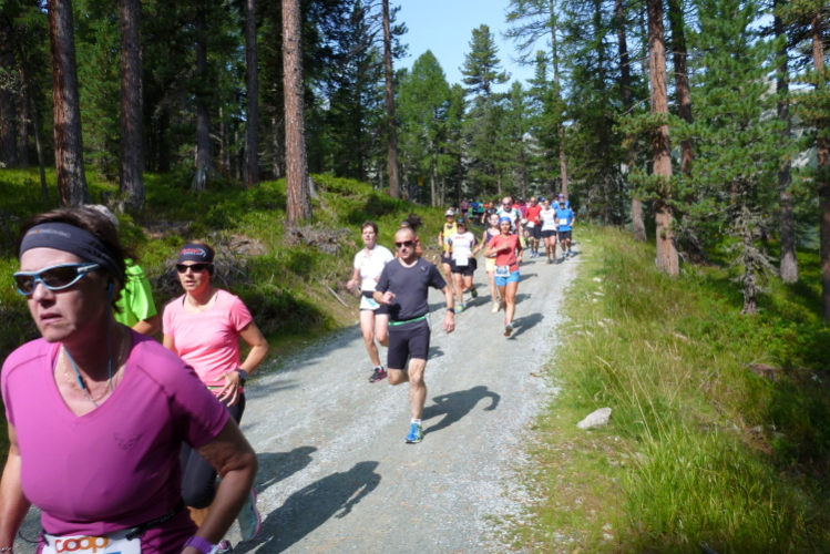 Es folgt ein wunderbarer, längerer Abschnitt auf gewundenem Pfad durch den Stazer Wald und, unter den Gleisen der Räthischen Bahn hindurch, der Abstieg in Richtung Pontresina, von wo die Muragl-Läufer gestartet sind. Namengebend für den kleineren Bruder unseres Laufs ist der Muottas Muragl, ein beliebter Ausflugsberg. Vorher jedoch können wir am kleinen Stazersee nochmals auftanken. Sehr schöne Wald- und Wanderwege bringen uns zur Ortschaft Celerina/Schlarigna, wo wir, schon in Reichweite des Ziels, nach gut 20 km wieder mit Flüssigem und Eßbarem versorgt werden.