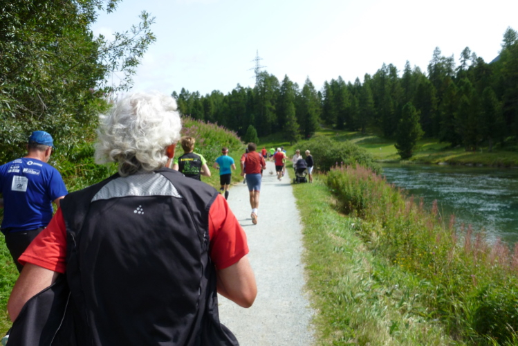 Weiter geht es am Champférsee entlang, wo man uns nach etwa sieben km zum ersten Mal verpflegt (Schwämme, Wasser, Iso). Wunderbar ist wieder der Blick zurück, zum jetzigen Zeitpunkt könnte das ewig so weitergehen. Dann komme ich sogar noch zu einem persönlichen Fan, denn überraschend steht Wolfgang Kindle, der gemeinsam mit uns im chesa surlej Hotel übernachtet und sich mit mir gestern zum Freien Fall hochgequält hat, an der Strecke. Den Champférsee haben wir dann bald hinter uns und laufen am Inn weiter. Richtig gelesen, am Inn! Ja, DEM Inn, denn der entspringt beim Malojapass in 2.484 m Höhe nahe dem Lunghinsee. Im Oberengadin wird er bis zum Zusammenfluss mit dem größeren Flaz auch Sela genannt und durchfließt zunächst den Silser-, den Silvaplaner-, den Champfèrer- und den St. Moritzersee.