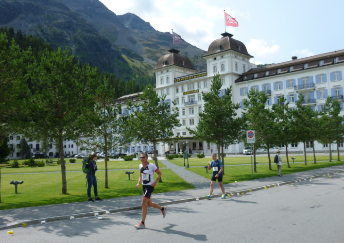Auf der anderen Innseite beglückt uns die nächste Steigung, die viele zum Marschieren nötigt. Ich habe mich auf ein flaches Rennen ohne Gehen eingestellt, daher ist das für mich keine Option. Frl. Suunto spricht hinterher von insgesamt rund 150 Bergauf- und 250 Bergabmetern. Wir nähern uns dem mondänen St. Moritz und kommen an einem Riesenspektakel vorbei, nämlich dem CSI St. Moritz, wo sich gerade die weltbesten Springreiter messen. Es ist das höchstgelegene Fünf-Sterne-Reitturnier Europas und bietet spannenden Pferdesport mit attraktiven Springprüfungen und begeisternden Shows in der einzigartigen Umgebung der Engadiner Bergwelt. Vor dem mondänen Kempinski Grand Hotel des Bains gibt es zum zweiten Mal Atzung.