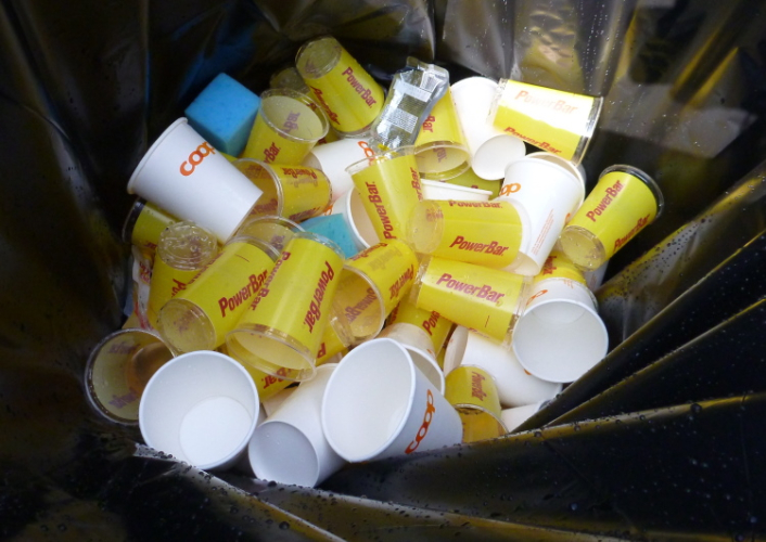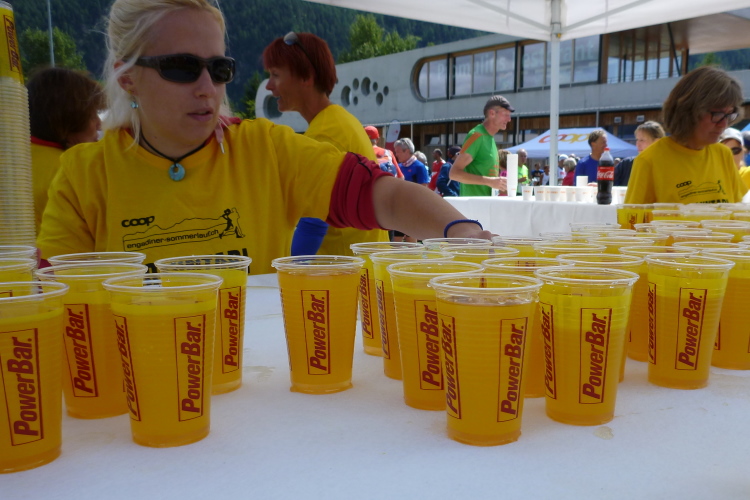 Der nächste Abschnitt ist optisch nicht ganz so prall, sobald wir aber, immer am Inn entlang, den St. Moritzersee erreichen, wird es wieder gewohnt attraktiv. Aus der Ferne übers Wasser und in der Sonne gesehen wirkt die Metropole der Schönen, Reichen und ganz schön Reichen netter als in der Realität. Bald schon ist auch der St. Moritzersee für mich Geschichte und die nächste ordentliche Steigung in Sicht, die so manchem schon erkennbar den zumindest vorletzten Zahn zieht. Frisch gestärkt geht es wieder in den Wald. Mein grünes Herz rebelliert beim Anblick der Abfallbehälter: Kunterbunt liegen dort Plastik- (PowerBar) und Pappbecher (Wasser, COOP) durcheinander, die vermutlich nicht sortiert und daher gemeinsam im Restmüll landen werden. Klar, man nimmt natürlich, was die Sponsoren bieten, aber ein einheitliches Bechermaterial wäre aus ökologischer Sicht sicherlich sinnvoll. Die gebrauchten Schwämme machen das Ganze nicht besser.