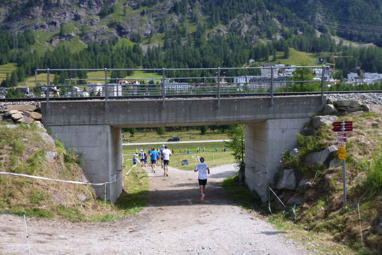 Vollständig flach geht es durch eine weite Wiesenlandschaft weiter. Das Geräusch eines laufenden Aggregats am Werbebogen des Mineralbads und Spas Samedan irritiert mich, doch bevor ich es geistig durchdringen kann, bin ich durch die eingebaute Dusche schon vom Wasser durchdrungen. Eine nette Idee! Wieder am Inn, lasse ich den finalen VP aus. Entlang des Flusses schleppen sich die letzten (Nordic) Walker des Muragl-Laufs dahin, die zu diesem Zeitpunkt die ihnen maximal zugestandene Zeit von zwei Stunden schon weit überschritten haben, aber dennoch tapfer die letzten Meter unter die Füße nehmen. Ich bewundere den Schlussradler, der alle Mühe hat, nicht vom Rad zu fallen. Die Zuschauerdichte nimmt deutlich zu und dann ist schon die Moderation aus der nahen Promulins Arena zu vernehmen, einem Sportzentrum, in dem auch die Startnummernausgabe nebst einer Sportmesse stattfand.