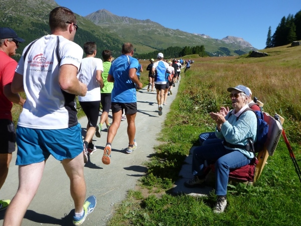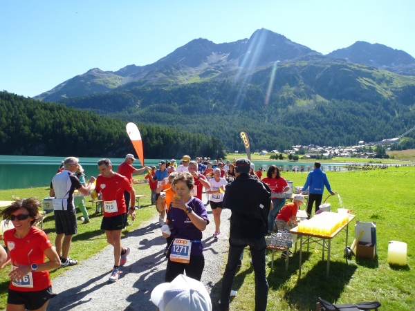 Wir verlassen das direkte Seeufer und laufen durch die frischen Wiesen. Ein betagtes Pärchen hat Campingstühle mitgebracht, sich am Rand der Laufstrecke niedergelassen und feuert uns ebenfalls an. Von Surlej aus, das zu Silvaplana gehört, kann man mittels einer Seilbahn den knapp 3500 Meter hohen Piz Corvatsch bezwingen. Von oben hat man einen grandiosen Ausblick auf die Bernina-Gruppe mit ihren riesigen Gletschern. Viele Italiener haben sich hier mittlerweile eine zweite Wohnung genommen. Überhaupt, recht viele Azzuris sind im Läuferfeld vertreten. Und mit denen habe ich jede Mühe, denn die laufen nicht einzeln, sondern ratschend in einer Gruppe. Ich fotografiere, die laufen im Breitkeil vorbei, und ich kann schauen, wie ich an denen wieder vorbeikomme.