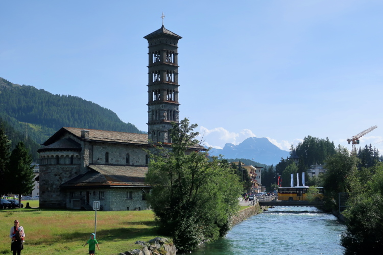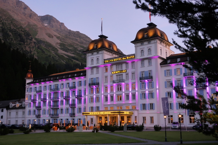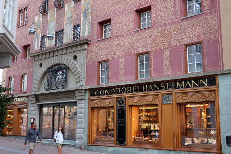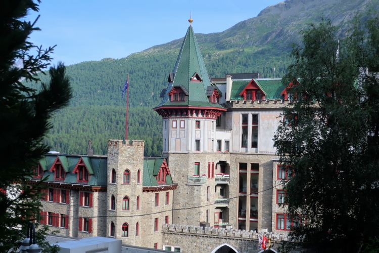 Im entspannten Jog am luftigen Seeufer entlang verdränge ich das noch ein wenig und bin schon gespannt auf das, was mich in der City von St. Moritz, hier ganz unprätentiös Dorf genannt, erwartet. Und das ist zunächst einmal ganz profan ein großes, aber unauffällig in den Hang gebautes Parkhaus. Lange Rolltreppen führen über die vielen Ebenen des modernen Parkhauses Serletta, mit 600 Plätzen das größte Parkplatzreservoir vor Ort, schnurgerade nach oben. Allerdings nicht für uns. Wir dürfen uns über die parallel verlaufende Treppe über neun Ebenen nach oben mühen. Zumindest katapultiert uns das sogleich ein ordentliches Stück in die Höhe und mitten ins Ortszentrum hinein. Direkt an einem der renommiertesten und mit seinen Türmen auch auffälligsten Hotelpaläste, dem Badrutt‘s Palace, kommen wir wieder ans Tageslicht. Nur ein paar Meter folgen wir der Via Serlas, der Luxusshopmeile des Ortes, schon schwenken wir in ein schmales Seitengässlein ab und setzen unseren Bergantrip durch den in den steilen Hang gebauten Ort fort.