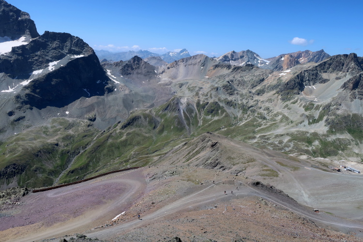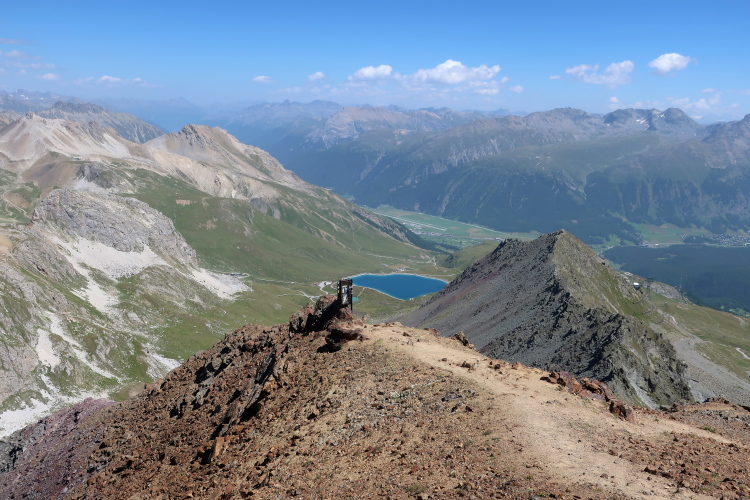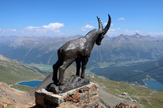 Optisch sehr eindrucksvoll ist schon die direkt neben der Bergstation auf einem Felsen thronende Skulptur eines riesigen Steinbocks, seines Zeichens Wappentier Graubündens, der von dort mit geneigtem Haupt über das unter ihm liegende Oberengadin blickt. Wer einfach nur faul sein will, dem sei die herrliche Sonnenterrasse der Gipfelstation mit Blick auf die noch höheren Zacken des Piz Albana und Piz Julier empfohlen. Für das wahre Gipfelerlebnis muss man aber noch ein paar Meter höher durch den Fels kraxeln, um dann auf 3.056 m üNN den ultimativen Rundumblick auskosten zu können. Und der ist in alle Himmelsrichtungen spektakulär.