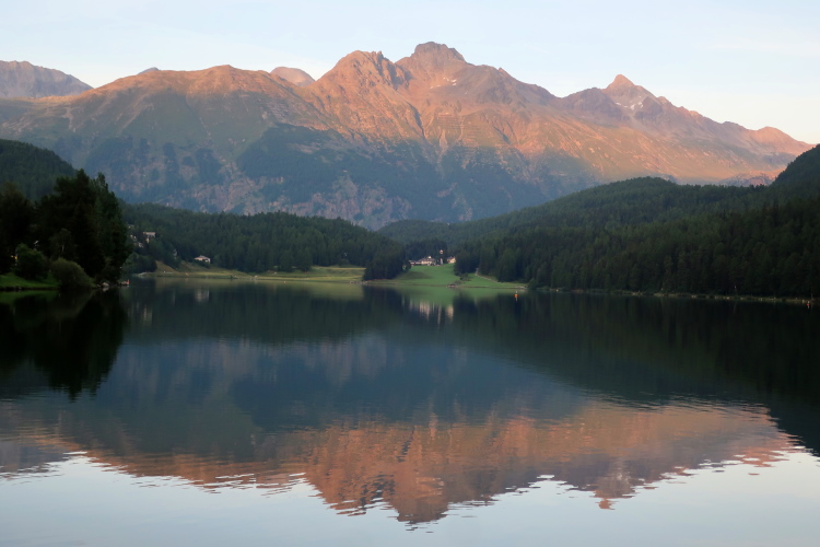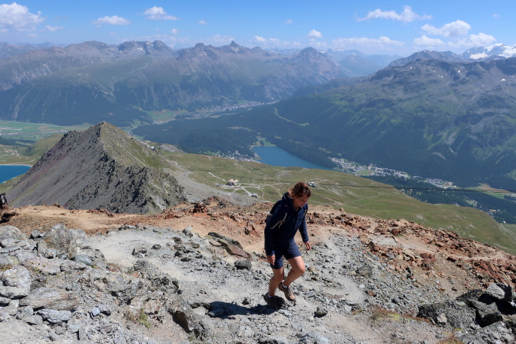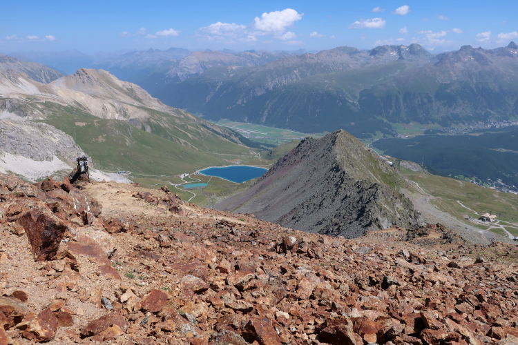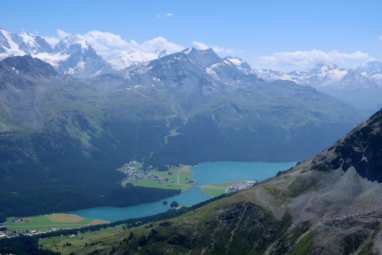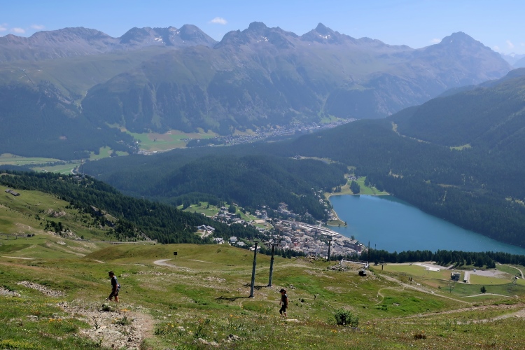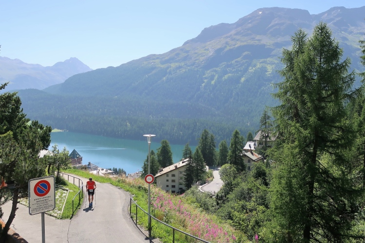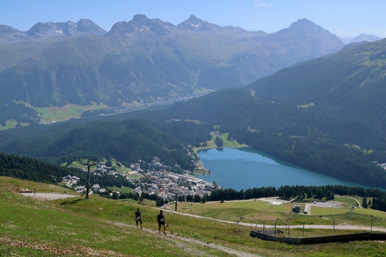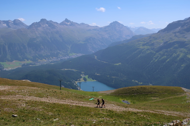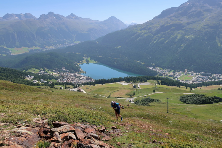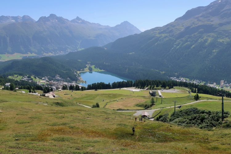 Da hilft nur ein gewisser Fatalismus. Froh bin ich, meine Laufstöcke dabei zu haben. Sie verleihen mir zusätzlichen Schub, mich Schritt für Schritt möglichst stoisch und gleichmäßig durch das Wiesengrün in die Höhe zu hieven. Die Verschnaufstopps nutze ich, den herrlichen und mit zunehmender Höhe immer weiter reichenden Blick über die Bergwelt der 3000er rund um den St. Moritzersee zu genießen …zumindest soweit es mit dem Genießen geht.