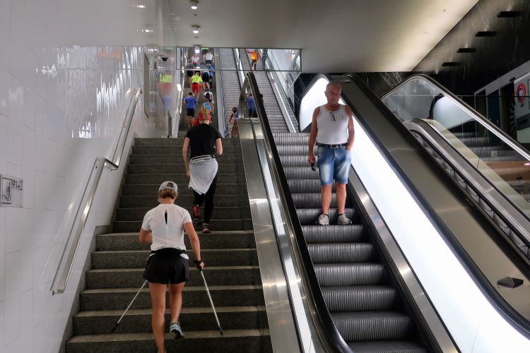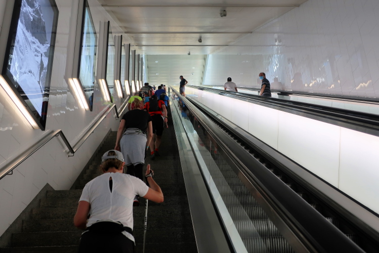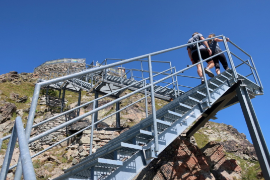Denn vor mir liegt der Weg, den auch jeder Skiabfahrer, der sich über diese Startrampe in die Tiefe stürzen will, nehmen muss: Der Weg über eine kalte Stahlgittertreppe, die sich parallel zur Piste in einer beeindruckenden Konstruktion in die Höhe schraubt. 187 scheppernde Stufen bedeutet das, 187 Schritte, die in der dünnen Höhenluft schnaufend zu bewältigen sind. Aber wir müssen nicht einmal Skier tragen!