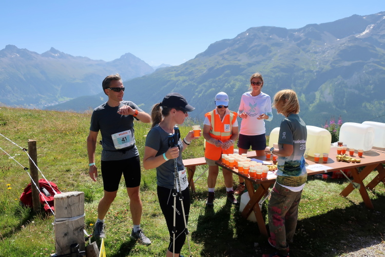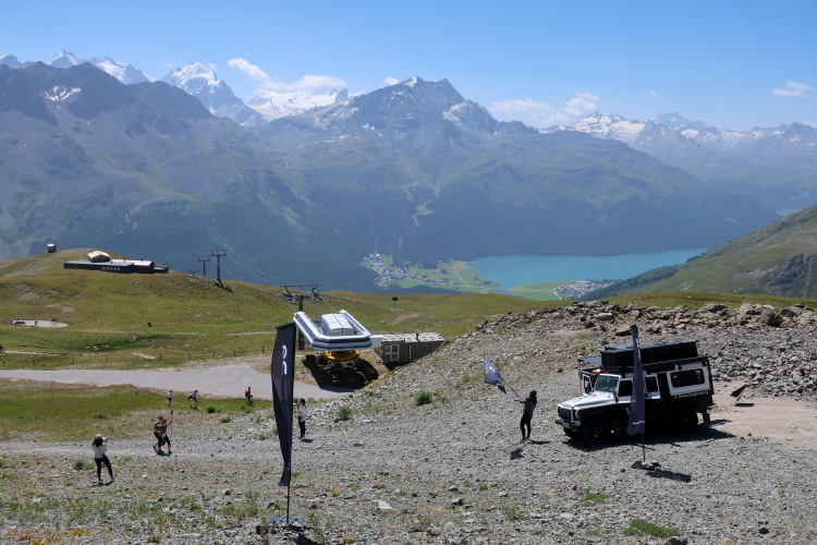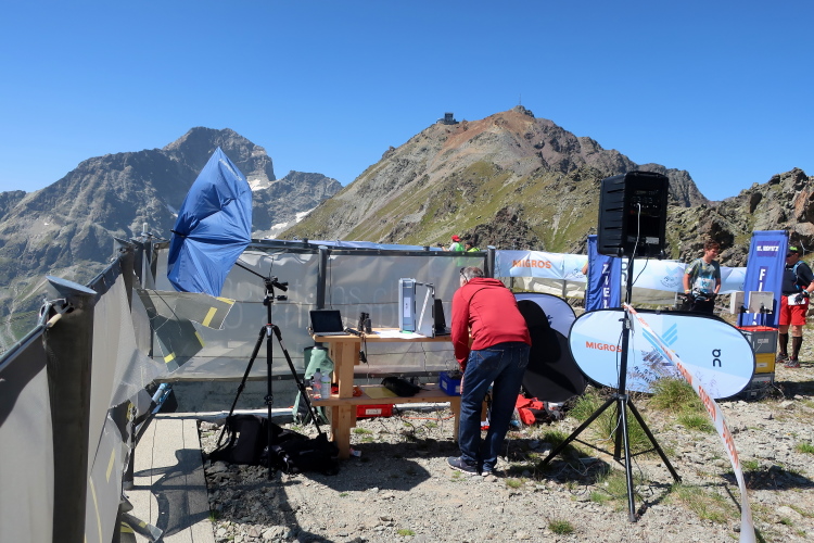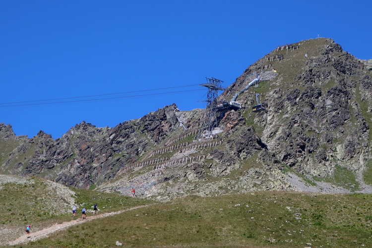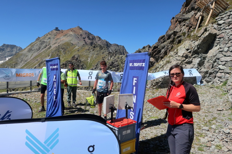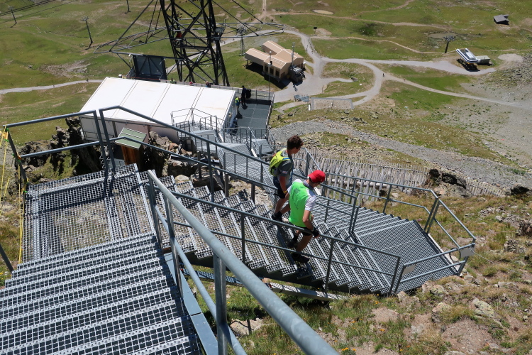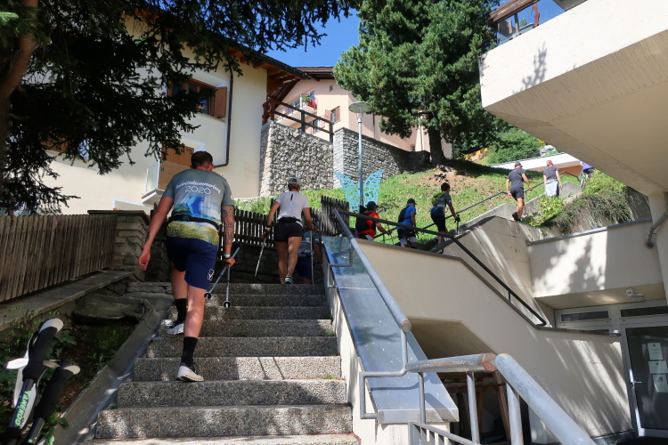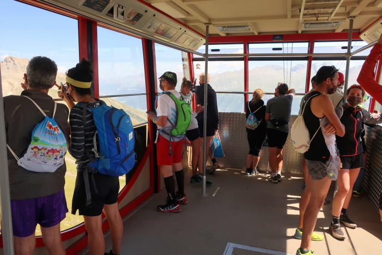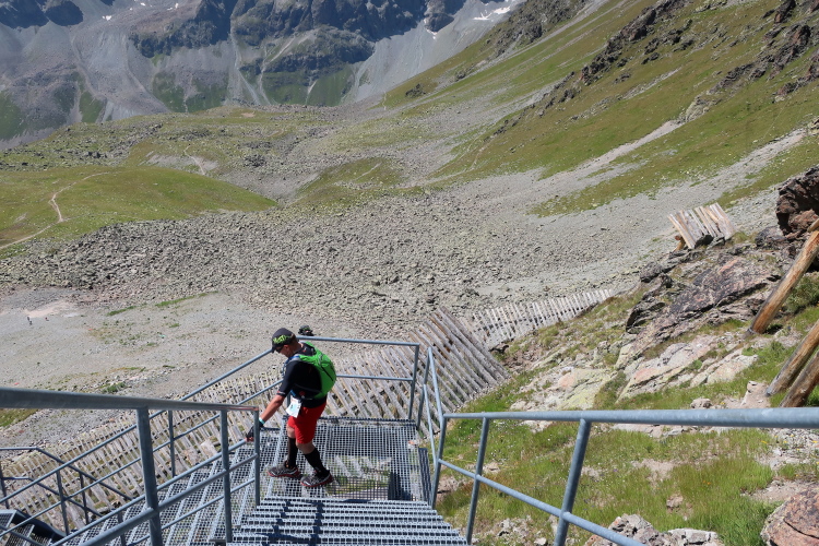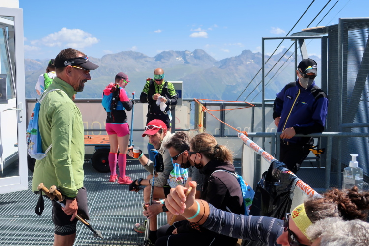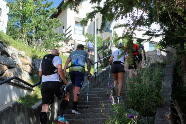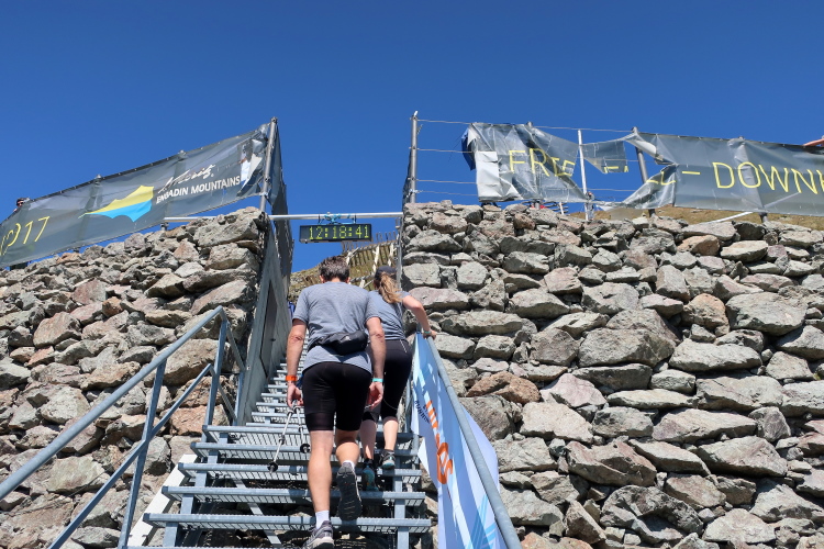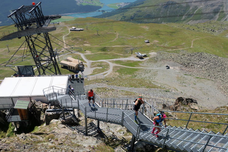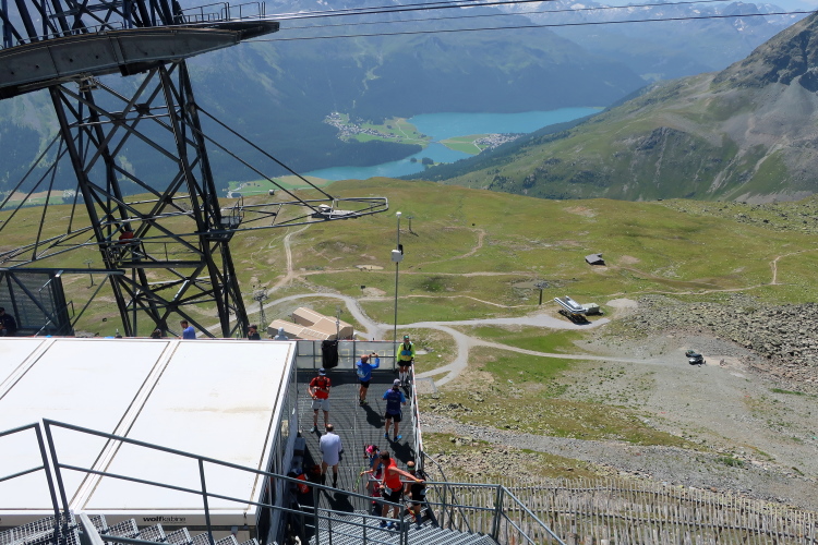 Ein ganz anderes, deutlich entspannenderes Gefühl ist der Abstieg über die Stufen zur Zwischenstation der Bergbahn. Hier ist eine Verpflegungsstation, auch mit Bouillon und Cola, für die Läufer eingerichtet, und hier warten die Läufer auch auf die Sonderfahrt mit der Gondel hinab zur Station Corviglia.