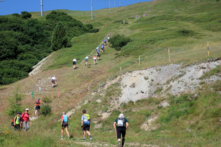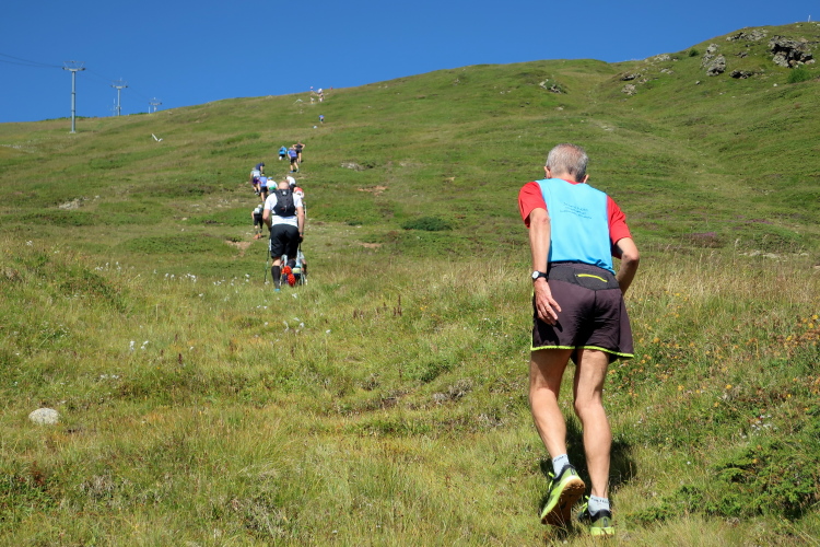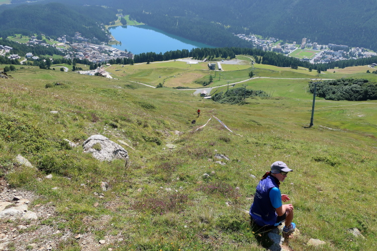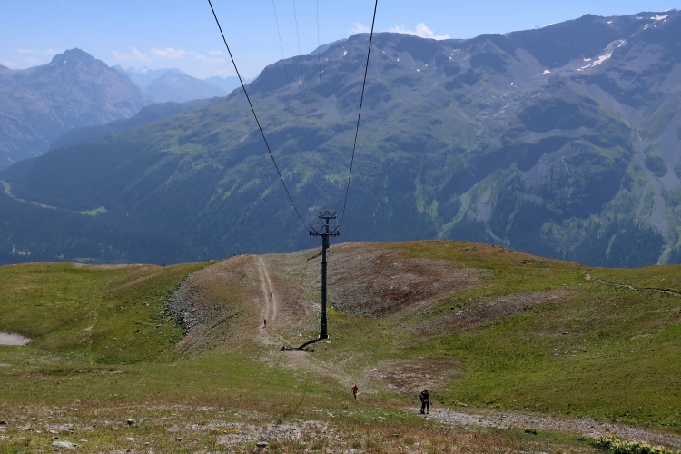 Denn durch einen schier endlosen Wiesenhang führt, parallel zu den Masten des im Sommer stillgelegten Sessellifts Salastrains – Munt da San Murezzan, schnurgeradeaus ein ebenso schier endloser Trampelpfad in die Höhe. Die Kette der winzigen bunten Punkte der Läufer verliert sich hoch über mir an der Grenze zum Himmelsblau. Und da soll ich nun rauf? Willkommen im Skigebiet Corviglia – Marguns - Piz Nair. Die alpinen „Haushänge“ von St. Moritz bieten den Wintersportlern auf 71,6 Pistenkilometern und mit 24 Liftanlagen die angeblich breitesten Pisten der Schweiz. Und so schaut es auch aus. Nur jetzt in grün.