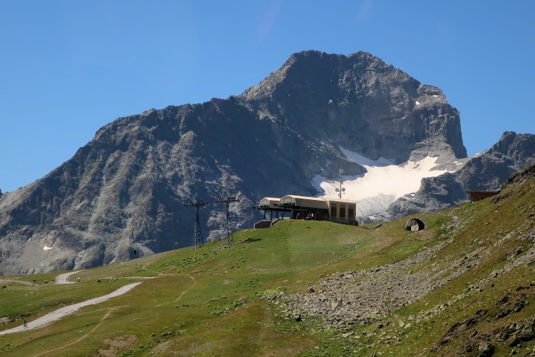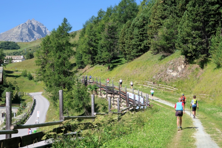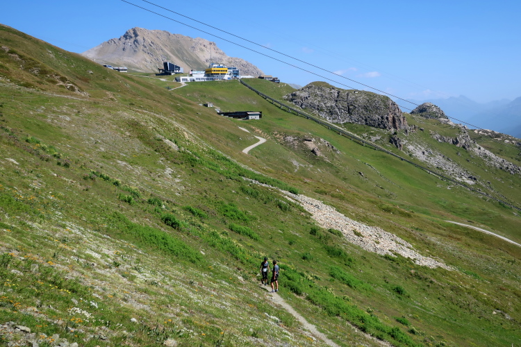 Über einen quer zum Hang verlaufenden bequemen Naturweg steuern wir das bereits auf 2.050 m üNN gelegene kleine Hochplateau von Salastrains an. Eine Erwähnung wert ist die Tatsache, dass ich hier tatsächlich wieder eine Passage laufen kann. Nachschicken muss ich allerdings: Es ist auch die letzte. Mit dem am Rande des Skigebiets Corviglia und noch per Straße erreichbaren Hotel Salastrains passieren wir den letzten Außenposten der Zivilisation auf unserem Weg nach oben.