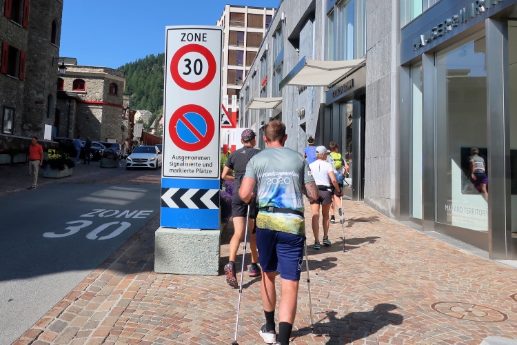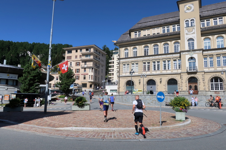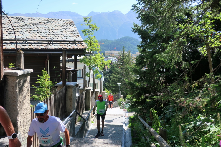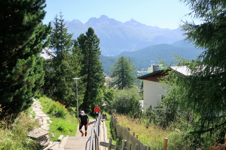 Mit der runden Plazza da Scoula erreichen wir den zentralen Platz von St. Moritz. Etwas versteckt gleich dahinter sehe ich die Talstation der in drei Etappen via Chantarella und Corviglia zum Piz Nair führenden Bergbahn. Mit einer gemütlichen Standseilbahn geht es hier los. Weniger gemütlich ist die Situation für uns. Denn über den Platz hinweg werden wir auf die so harmlos klingende Via da l’Alp gelotst. Die Via entpuppt sich als eine nicht endend wollende Aneinanderreihung von Treppen. Keuchend, schwitzend und innerlich fluchend stapfe ich an den in den Steilhang gebauten und in reichlich Grün eingebetteten Häusern vorbei. Wie die hier lebenden Menschen wohl ihren Einkauf erledigen? Ich fühle mich schon fertig, kaum, dass der Lauf begonnen hat. Immerhin habe ich bis 14:00 Zeit, das Ziel zu erreichen – das sollte wohl genügen.