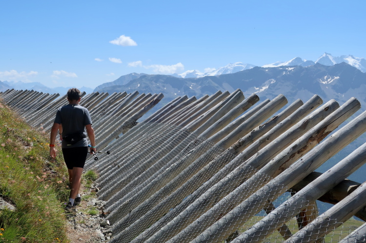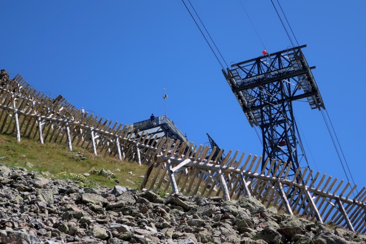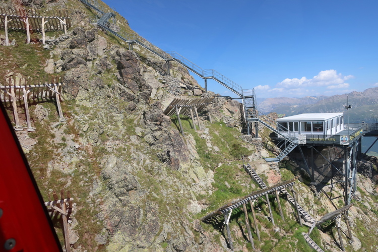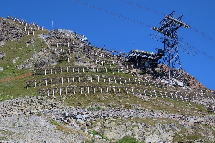 Anfangs ist mir noch nicht so recht klar, wie ich da nun eigentlich hinaufkommen soll. Ein für mich nicht immer eindeutig erkennbarer Pfad windet sich zunehmend steiler durch das graue Geröll. Jedenfalls führt der Weg nicht direkt über den Free Fall – das wäre schlicht zu gefährlich – sondern durch das Gelände nebenan. Immer mühseliger wird der Anstieg durch das Gestein. An einem schräg im Boden verankerten Fangzaun aus massiven Holzpfählen entlang und sodann über eine Holztreppe gelange ich schließlich auf die Plattform der Zwischenstation der zwischen Corviglia und Piz Nair verkehrenden Gondel. Am Ziel bin ich damit aber noch nicht.
