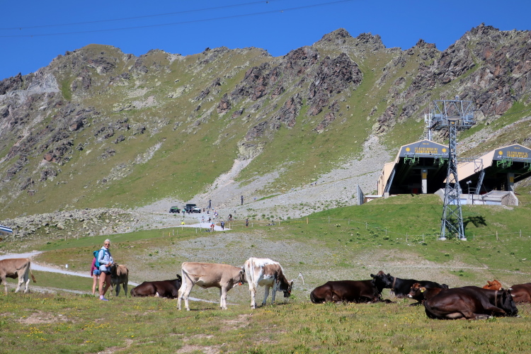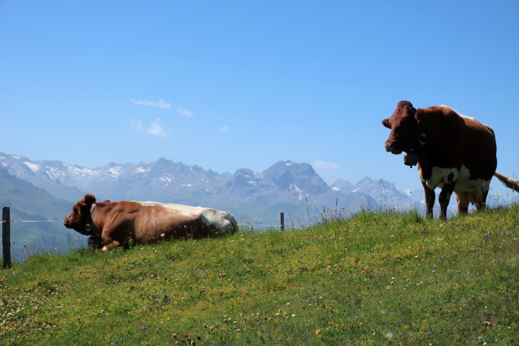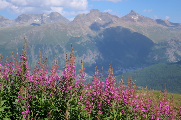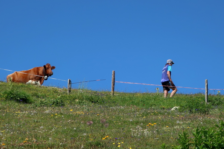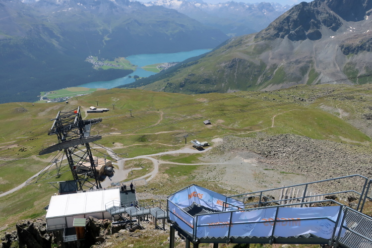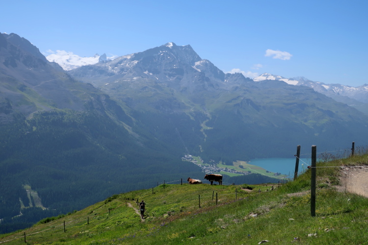 Und weiter geht es auf einem schmalen steinigen Pfad durch die unendlichen Almwiesen, nicht mehr gar so steil, aber weiterhin beständig aufwärts. Um die Bergflanke herum erweitert sich mein Blickfeld, vor allem auf den sich tief unten im Tal so malerisch zwischen dem dunklen Grün der Bergwälder windenden Silvaplanersee. Gedanken an morgen kommen auf: Denn der Kurs des Engadiner Sommerlaufs führt auch an diesem See vorbei. Ansonsten ist in meinen Höhen die Abwechslung rar, auch wenn immer wieder bunte Blumenteppiche für farbliche Tupfer sorgen. In der Ferne leuchtet gelb die Bergstation Corviglia. Ein paar Kühe beobachten kuhmäßig interessiert das sonderbare Treiben der buntgewandeten Zweibeiner auf dem Weg in die Höhe. Ja, und dann sind da natürlich die zahllosen Metallpfosten in der Landschaft, nicht ganz so malerische sommerliche Reminiszenzen an den winterlichen Skizirkus.