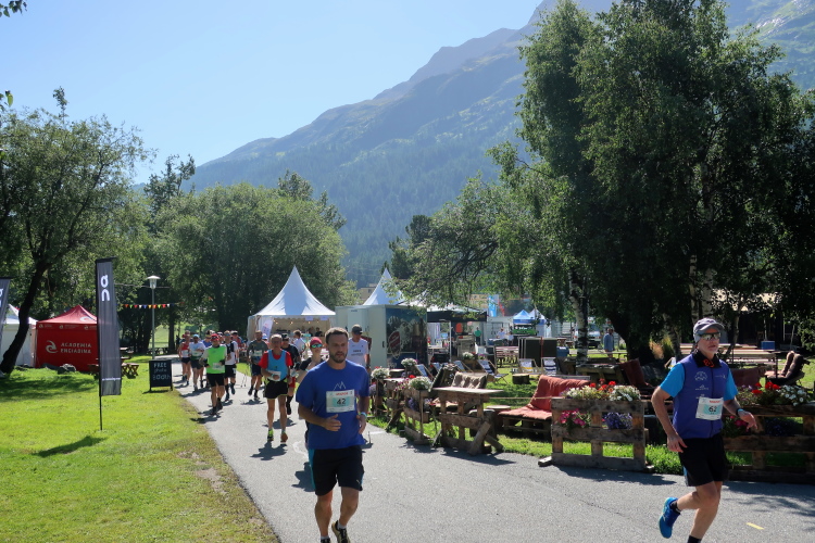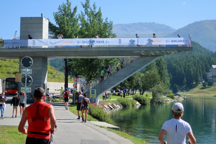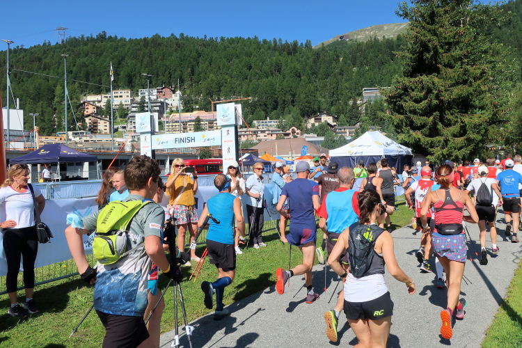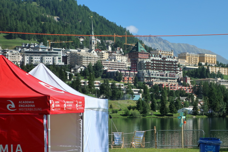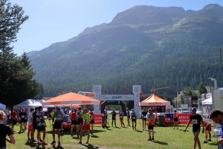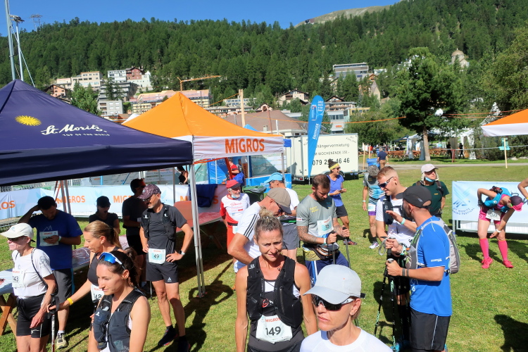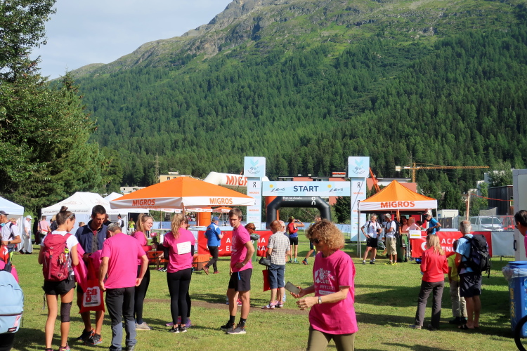 Bevor es ans Laufen geht, führt der Weg einen jeden erst einmal ins „Festival Village“. Auf dem Wiesengelände zwischen dem Eisstadion Ludains in St. Moritz Bad und dem St. Moritzersee schlägt das Herz der Veranstaltung. Hier starten und enden zum Teil die Läufe, hier wird drei Tage lang von Freitag bis Sonntag gegessen, getrunken, geratscht, gefeiert, eingerahmt von einem Programmangebot von Livemusik bis Yoga. Mehrere mobile Gastrostände und Bars sorgen für das leibliche Wohl. Dazwischen sind zahllose Bänke und Tische, auch Liegestühle locker verteilt aufgebaut, dazu eine Bühne.