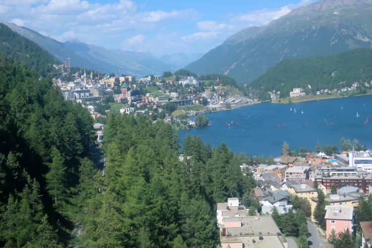 Allmählich werden die Treppen weniger, ist der Anstieg nicht mehr gar so heftig. Unser Weg mündet in ein kleines Fahrsträßlein. In Serpentinen windet sich die Via Tinus allmählich in die Höhe. Ein kühlender Wind macht das Fortkommen in der mit Kraft herab brennenden Sonne erträglicher. Belohnt werden wir mit ersten herrlichen Ausblicken über die Dächer von St. Moritz das tiefblaue Seeoval.