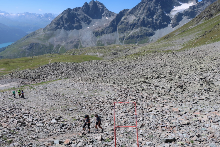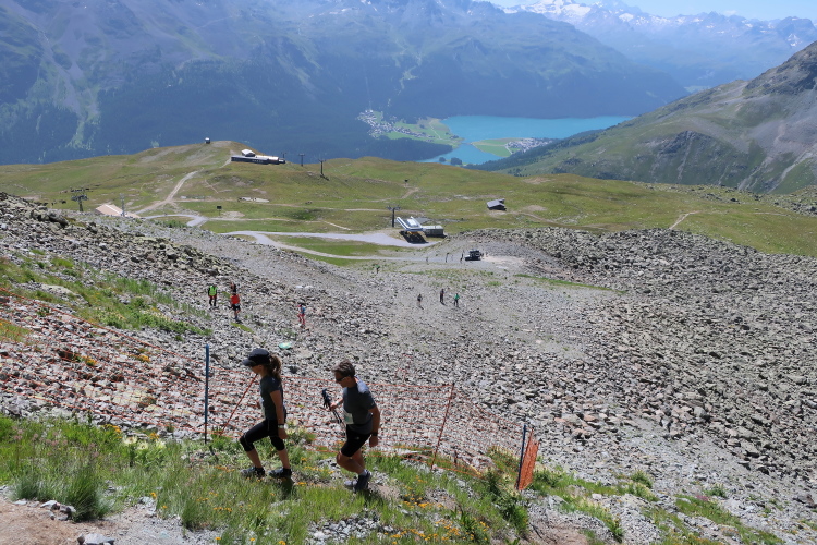 Bis zum Finale muss ich mich aber noch ein wenig gedulden. Beim weiteren Anstieg über einen gerölligen Hang füllt zunächst allein dieser das Blickfeld. Zumindest kann ich mir gedanklich ausmalen, dass ich mich wohl gerade auf der originalen Skiweltmeisterschaft-Rennpiste der Herren-Abfahrt befinde. Immerhin fünf Mal war St. Moritz seit 1934 bereits Austragungsort alpiner Skiweltmeisterschaften und damit öfter als jeder andere Ort auf der Welt. Mit dem aufgrund einer Idee des einstigen Weltmeisters Bernhard Russi konzipierten und gebauten „Free Fall“ als Einstieg hat die Abfahrtsstrecke von St. Moritz seit der WM 2003 ihr ganz besonderes Markenzeichen.