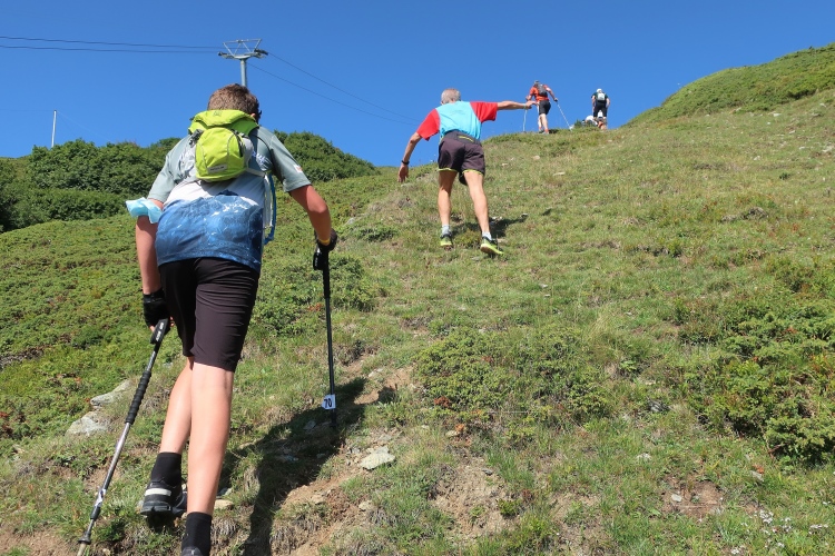 Eine gemütlich in der Wiese kauernde Kuhherde steht für einen kurzen flacheren Abschnitt, an dem ich mich zwar nicht erholen, aber etwas Luft schnappen kann. Zunehmend wie eine Wand baut sich der eingerüstete Felsenturm vor mir auf. Von einem im Geröll zu Füßen dieser Wand drapierten Land Rover des Sponsors On dringen über Megaphon laute Anfeuerungsrufe an mein Ohr. Zwei Mädels geben ihr Bestes, jeden einzelnen Ankömmling zum finalen Anstieg zu motivieren.