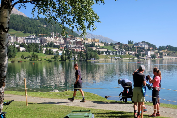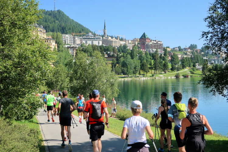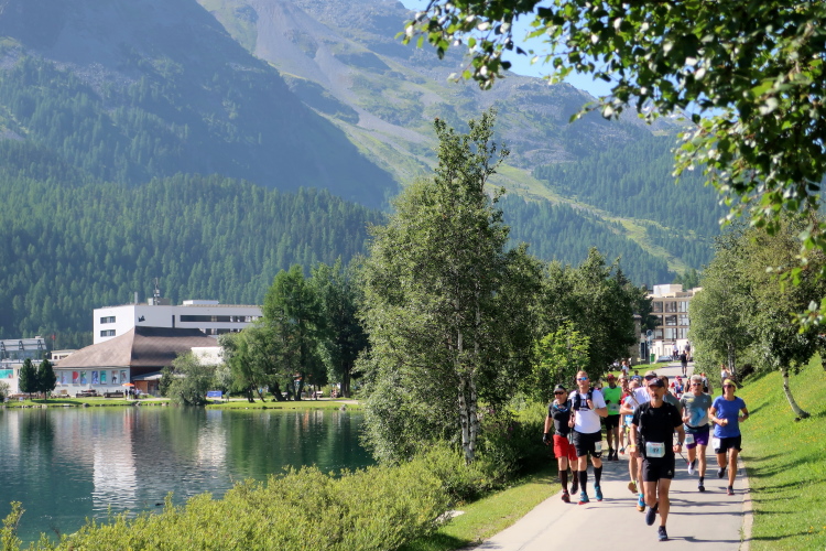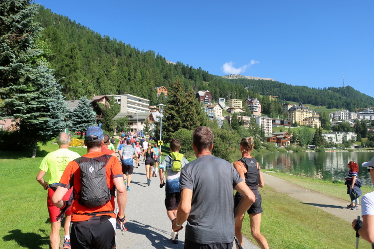 Pünktlich geht es los. Und mit dem Startschuss offenbart sich ein weiterer Vorteil der Startplatzverlegung. Denn zumindest auf dem ersten Kilometer fühlt sich dieser Lauf eben noch wie ein solcher an. Vom Festivalgelände aus steuern wir im flotten Trab direkt der Seepromenade des St. Moritzersees entgegen. Malerisch zu Füßen der sich am Nordufer türmenden „Skyline“ altehrwürdiger St. Moritzer Luxushotels gelegen ist der Lej da San Murezzan, wie er rätoromanisch heißt, der nordöstlichste und kleinste der vier Seen der Oberengadiner Seenplatte, nichtsdestotrotz deren prominentester Vertreter. Vor allem im kalten Winter erwacht hier bzw. auf seiner zugefrorenen Oberfläche das Leben, sei es bei Pferderennen, Polo oder Langlauf. Über das dunkle kalte Wasser hinweg genießen wir den Panoramablick auf St. Moritz und die dahinter aufsteigenden Berge, allen voran den 3.056 m hohen Piz Nair. Und das ist „unser“ Berg, der Berg, den es zu bezwingen gilt.