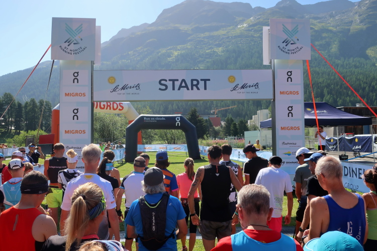 Im Gegensatz zu früheren Ausgaben startet der Free Fall Vertical nicht mehr mitten in St. Moritz, sondern direkt auf dem Festivalgelände. Das hat gleich mehrere Vorteile. Einer davon ist, dass es von meinem Hotel nur ein kurzer Spaziergang hierher ist und einem entspannten und ausgiebigen Frühstück als Carboloading nichts entgegensteht. Für 10:30 Uhr erst ist der Start terminiert. Etwa 100 Wagemutige, Neugierige, man könnte auch sagen: Verrückte, sind es, die sich voll Optimismus und Übermut zu diesem „Laufhappening“ angemeldet haben und sich nun im Startkanal sammeln. Die Sonne lacht vom Himmel heizt uns schon vor dem Start ein. Der Moderator und entspannte Musik tun ihr Übriges, die Laune und Vorfreude hoch zu halten.