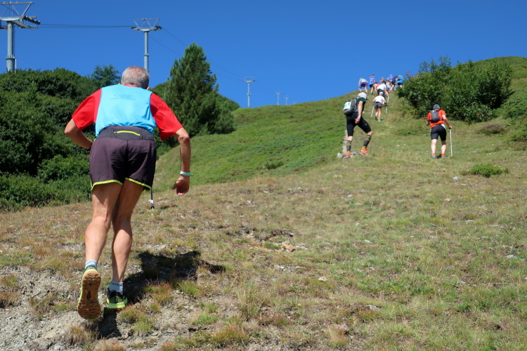 Eine knappe halbe Stunde dauert die Plackerei, dann endlich flacht die Steigung ab. Wie eine Oase in der „grünen Wüste“ der Almen mutet der Verpflegungsstand nach 4,5 km an einer ebenen Stelle an. Es tut gut, das angebotene Wasser und den Isodrink durch die Kehle rinnen zu lassen.
