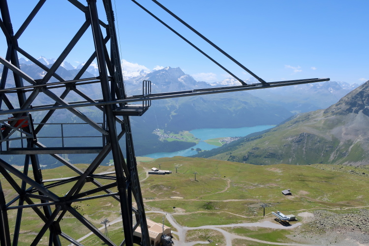 Blickt man von der Zwischenstation in die andere Richtung, so lockt jedoch ein Stück weiter oben sehr viel mehr der Gipfel des Piz Nair. Und diesem Locken sollte man unbedingt nachgeben. Um dorthin zu gelangen, muss ich jedoch zunächst die Sondergondel nach Corviglia nehmen, um dann mit einer im 20 Minuten-Takt verkehrenden „regulären“ Gondel ganz hinauf zu kommen.