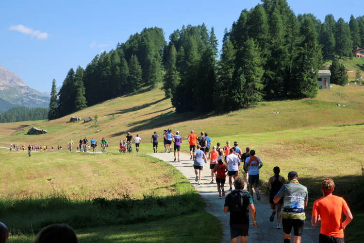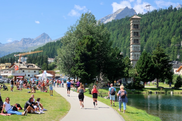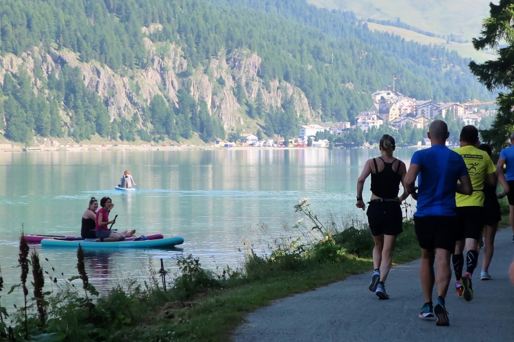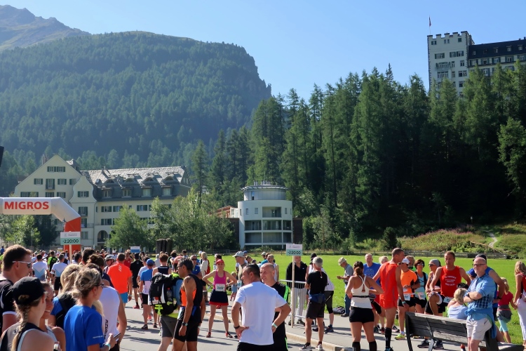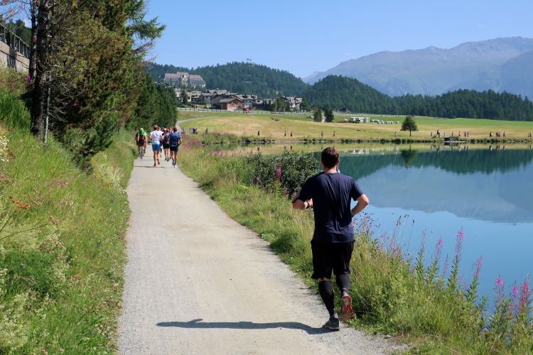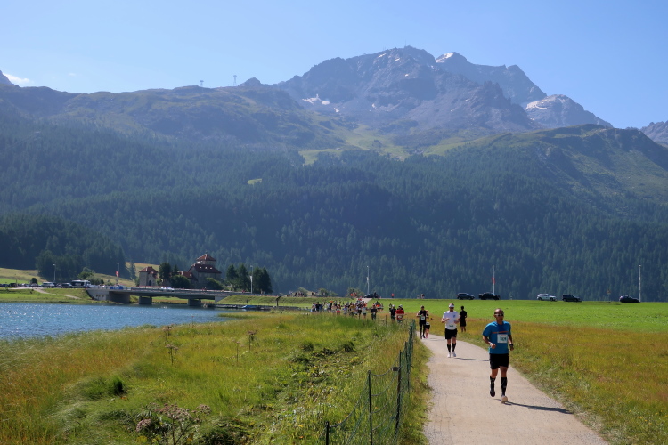 Vom Ende des Sees aus führt der breite Naturweg weiter durch den Wald, geradewegs auf den St. Moritzersee zu. Schon bald sehe ich in der Ferne den Gipfel des Piz Nair, mit 3.056 m Höhe sozusagen der Hausberg von St. Moritz, und erstes Seenblau durchschimmern. Dank des leichten Gefälles rückt der See und mit ihm die Kulisse von St. Moritz Dorf schnell näher. Von der historischen Meierei, einst bischöfliches Anwesen, jetzt ganz weltlich als Landgasthof genutzt, sollte der Kurs eigentlich direkt zum See hinunter und dort am Ufer entlang bis zum Ziel im Festivalgelände führen. Eine schöne Vorstellung, ein entspanntes Auslaufen. Schon am Start wurde uns allerdings offenbart, dass umständehalber umgeleitet werden muss. Das Ergebnis der Umleitung ist leider nicht ganz so entspannt. Denn hinein und hinauf geht es wieder in den blickdichten Wald, den wir erst dann verlassen dürfen, als wir die „Banlieue“ von St. Moritz, ein gesichtsloses Neu- und Hochbauviertel am Rande von St. Moritz Bad erreichen. Im gefühlten Zickzack geht es hier durch, ehe sich der Weg final hinab in die weiten Uferwiesen am See absenkt.