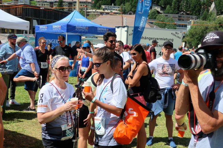 Die Klammer für alle Läufe bildet jedoch das „Festival“. In wundervoller Lage direkt am See, neben dem Eisstadion Ludains in St. Moritz Bad, ist das Festival Village angelegt. Zahllose Tische, Bänke, auch Kissen und Liegestühle zwischen Zelten, Buden und Pavillons mit reichlich kulinarischer und getränkemäßiger Auswahl laden vor und nach dem Laufen zum „Abhängen“ ein, Musik, live und aus der Box, liegt in der Luft. Hier wird gefeiert und gechillt, gestartet und gefinisht, von früh bis spät. Selten habe ich einen so stimmungsvollen „Apres Run“ erlebt.