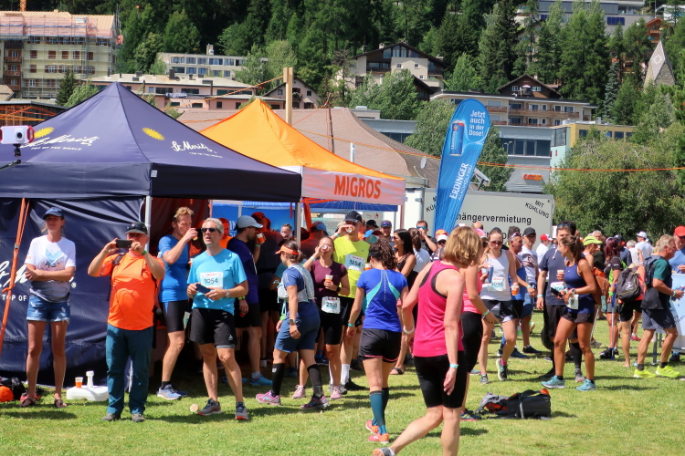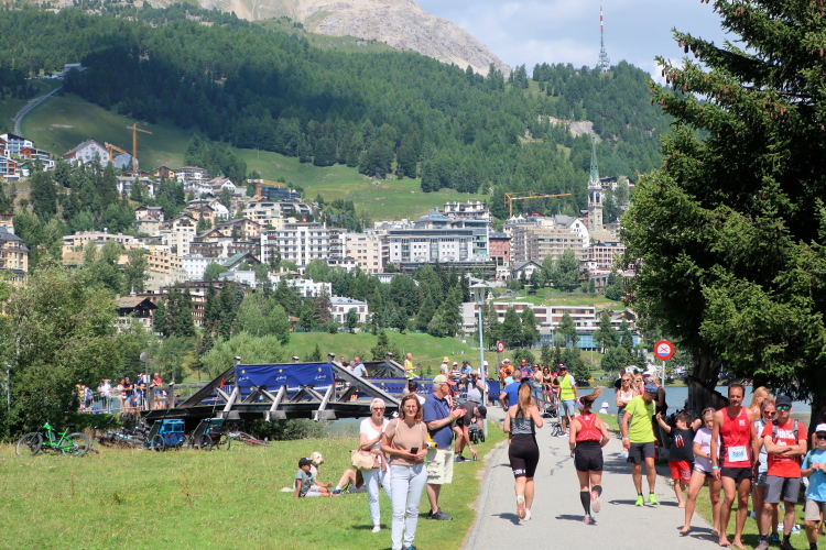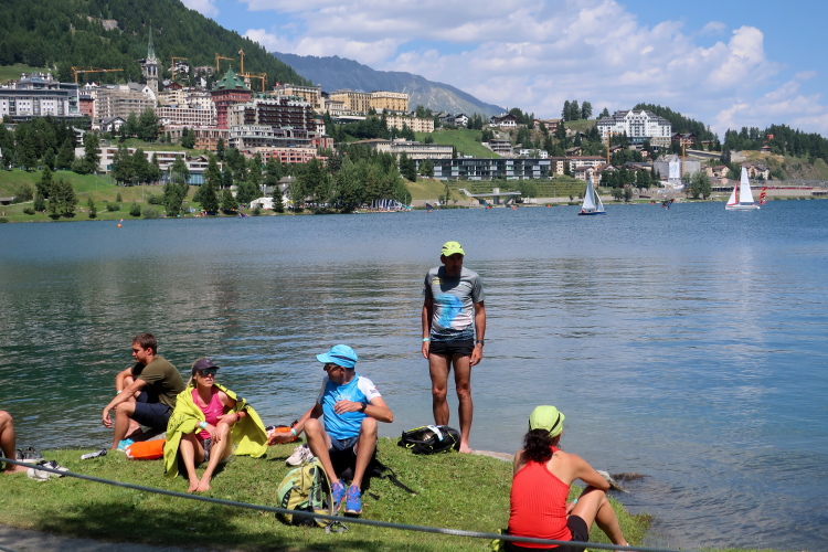 Ein schönes und entspanntes Bild bietet sich hier: Zahlreiche Menschen liegen im Gras und am See, die sommerliche Stimmung nutzend. Beifall begleitet uns auf den letzten Metern. Herrlich ist der Blick über das Seenrund, hinüber nach St. Moritz Dorf. Vorbei an der einsamen und irgendwie sehr italienisch wirkenden Borromäuskirche und die Holzbrücke am Zufluss des Inns in den See querend, geht es hinein in den eingezäunten Zielkanal und vom Moderator begrüßt unter dem Zielbogen hindurch.