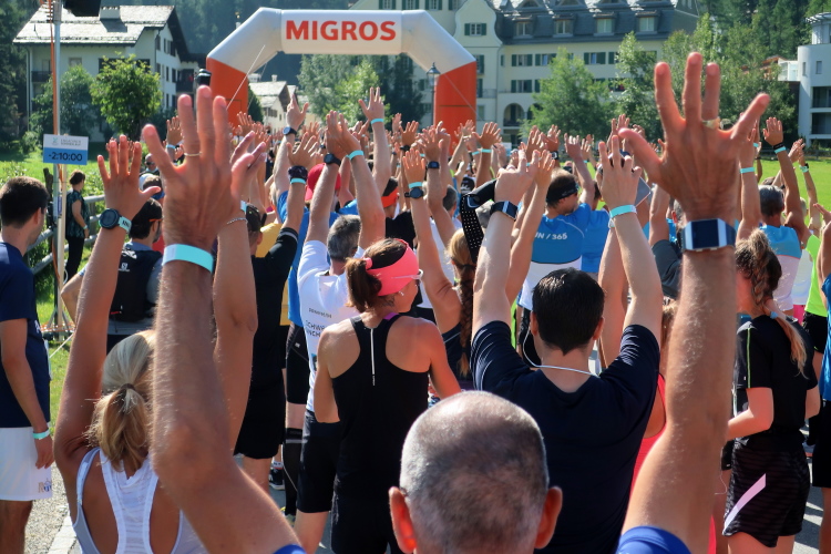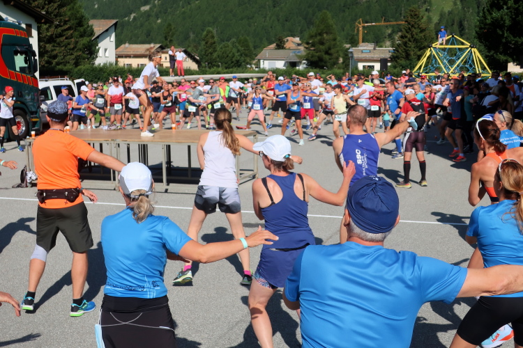 Ich ziehe weiter in Richtung Schulhaus, denn noch habe ich 1 ¼ Stunden Zeit, bevor es für mich losgeht. Zusehens füllt sich dort der Pausenhof. Schon bald zeigt die Sonne ihre Kraft und ich bekomme eine Vorahnung, dass das trotz der Höhe heute schweißtreibend werden kann. Zumindest wird bereits am Start ein Getränkestand bereitgehalten. Und reichlich stille Örtchen, um den Flüssgkeitsüberschuss wieder loszuwerden, gibt es obendrauf. Mit Musik und Infos werden wir unterhalten. Mehr als nur Unterhaltung ist es, als eine höchst motivierte Fitnesstrainerin die kleine Bühne auf dem Hof entert und zu donnernden Rhythmen das „Warming Up“ zelebriert. Wie erfolgreich sie dabei ist, belegen die Scharen, die sich zum Mitmachen animieren lassen. Erst als der Startmoderator gut zehn Minuten vor dem Start einen Hinweis gibt, zieht die Karawane der Wartenden gemächlich los in Richtung Startkanal und nimmt locker Aufstellung. Ein letztes Motivations-Hands Up, dann ertönt um 10:15 Uhr der Startschuss.
