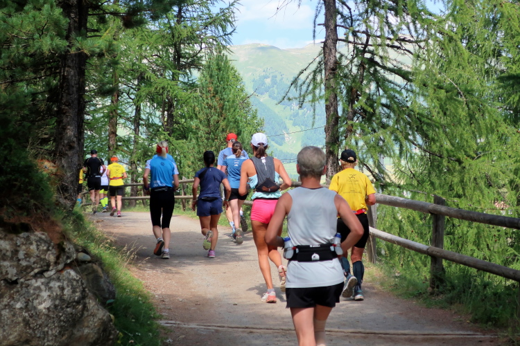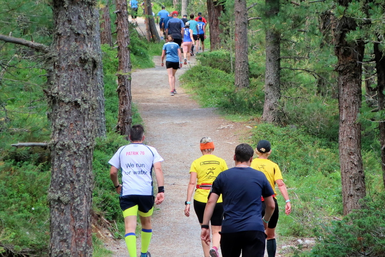 Kurz nach km 20 ist es so weit. Aus dem Tal hinaus windet sich unser Weg durch den Wald weiter und weiter in die Höhe. Das Feld um mich herum ergibt sich in sein Schicksal und stapft stoisch. bergan. Erneut führt uns der Weg durch den so schönen Stazerwald. Lauf- und Gehpassagen wechseln einander ab. Mit mehr und mehr Wanderern und vor allem Mountain Bikern müssen wir uns den Weg teilen, je näher der Stazersee rückt. Ein schönes Gefühl ist schließlich, sich in leichtem Trab dem Blau des Sees anzunähern und noch schöner, nach gut 22 km ein letztes Mal unterwegs mit Seeblick verpflegt zu werden.