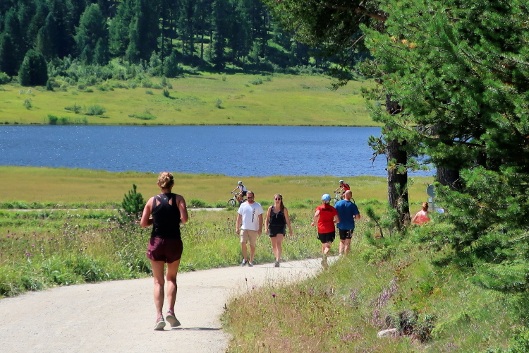 Das Gelände bringt es freilich mit sich, dass es auf dem breiten Naturweg ständig auf und ab geht, nie dramatisch, aber beständig. Etwa 15 km liegen hinter mir, als ich zwischen den Bäumen den Stazersee (Lej da Staz) erblicke. Überaus idyllisch ist die Lage des von Moorwiesen und Schilfbeständen umrahmten Gewässers, einem der beliebtesten Ausflugs- und dank des vergleichsweise warmen Wassers auch Badespots der Region. Traumhaft ist die Lage des kleinen Hotel Restaurants Lej da Staz am Ostufer, vor allem die Sonnenterrasse mit Panoramablick über den See und die Bergwelt im Hintergrund. Ein schönes Gefühl ist zu wissen: Auf unserem weiteren Weg kommen wir erneut hier vorbei, nur dann an anderer Stelle.