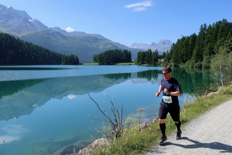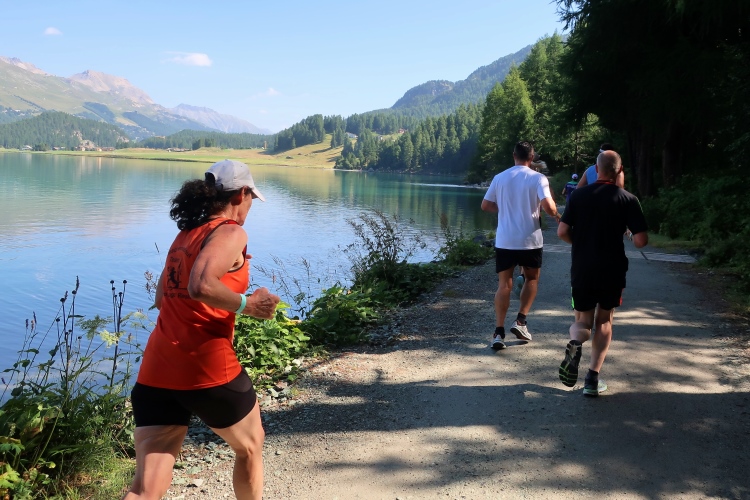 Zunächst direkt an der Uferlinie folgen wir dem kurvigen Verlauf des Süd- und dann Ostufers des Sees. Wundervoll ist der Blick über das stille Wasser, die sich wie Wellen in tiefem Grün darin ergießenden bewaldeten Hügel und die, wohin man auch schaut, alles in lichtem Grau und Weiß überragenden Berge im Hintergrund. Aus den saftigen Wiesen am Südufer treten wir hinein in den schattigen Wald am Ostufer. Es ist ein sehr entspanntes Laufen, mal direkt am Wasser, mal versunken im Nadelgehölz, nun auch mit ersten profilierten Passagen. Am gegenüberliegenden Ufer sehen wir den namengebenden Ort Silvaplana. Wirklich nahe kommen wir ihm aber nicht.