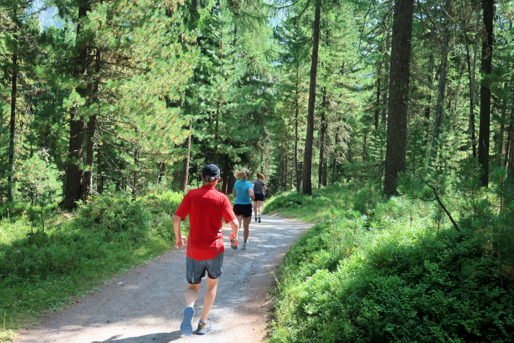 Der Stazerwald bestimmt als Laufrevier unseren weiteren Laufkurs. Dieser eiszeitlich hügelig geformte Wald ist als Naturdenkmal deklariert. Primär Lärchen, Bergföhren und Arven gedeihen hier, mal dicht an dicht, mal locker verteilt. Zahlreich sind die Lichtungen, was dem Wald eine gewisse Luftigkeit und Leichtigkeit verleiht und auch immer wieder schöne Ausblicke in die Ferne ermöglicht.