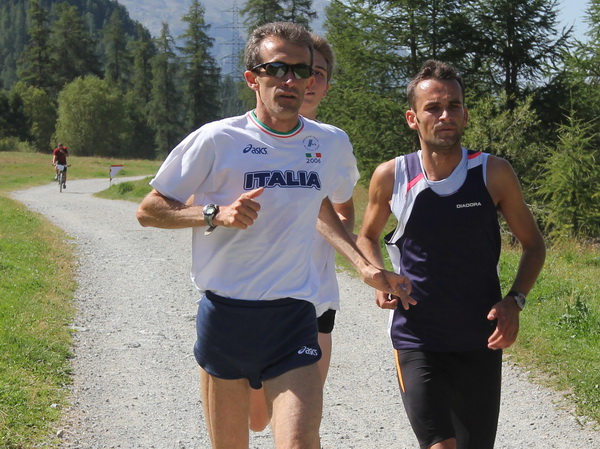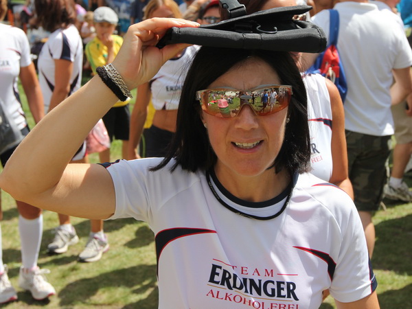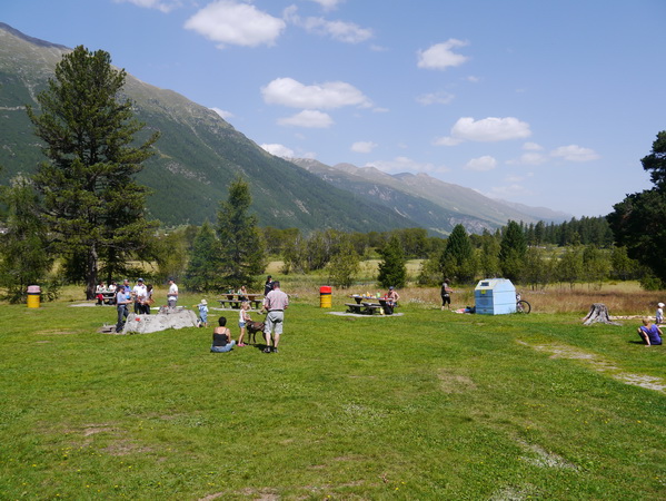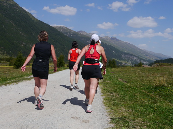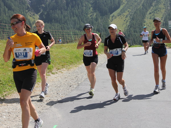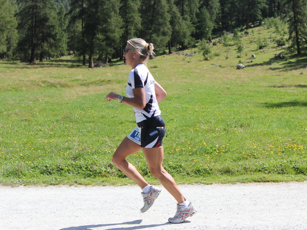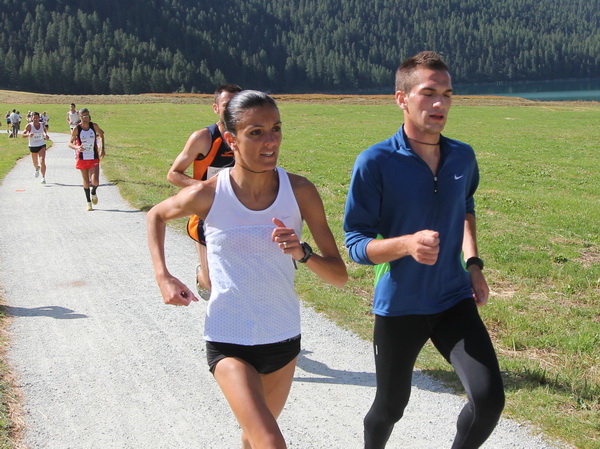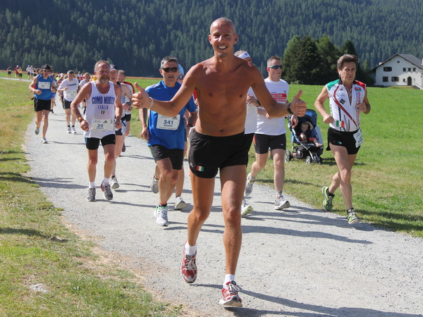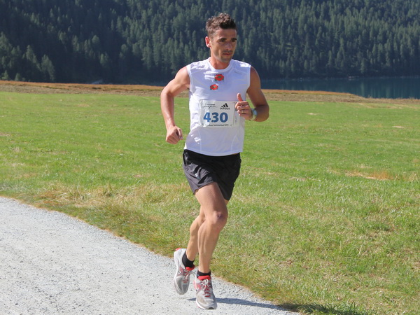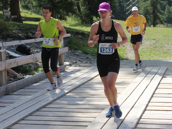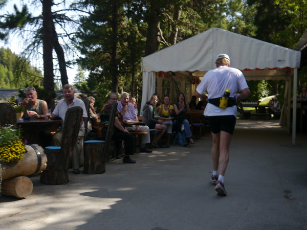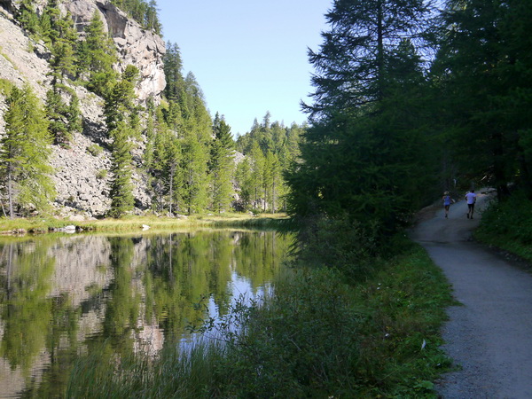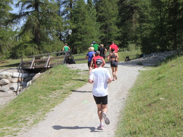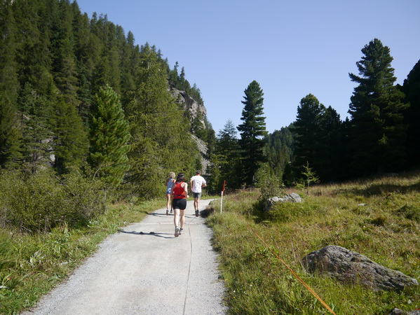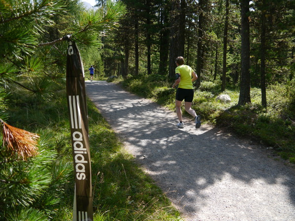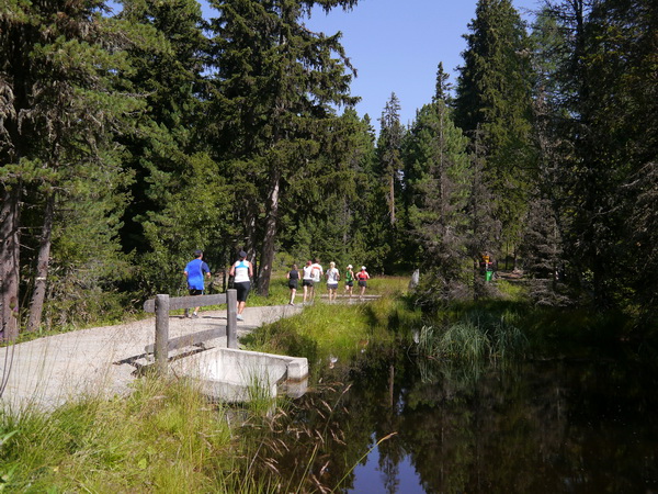 Der malerische Stazer See (km 15) ist nur ein kleines Gewässer. Den vielen Badegästen nach zu urteilen ist er auch nicht tief und deshalb auch nicht sehr kalt. Ich würde es ja schon gerne testen, belasse es dann aber bei der Erfrischung, die es an der nahe gelegenen Verpflegungsstelle gibt. Wieder kommt ein kleines Waldstück. Der Schatten tut gut. Die Temperaturen sind ja aufgrund der Höhe gar nicht extrem, man empfindet sie aber so.