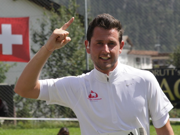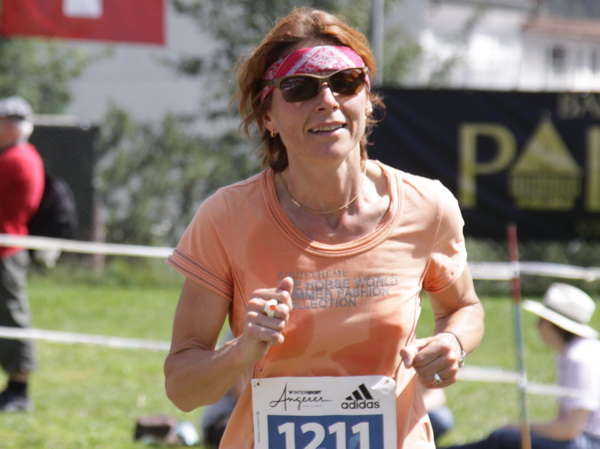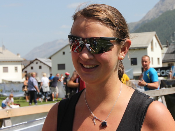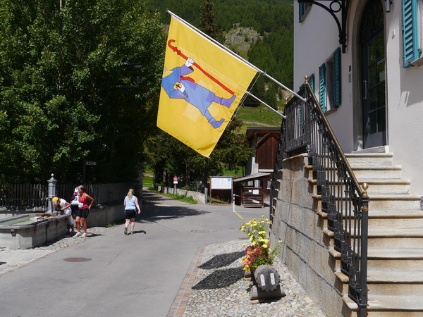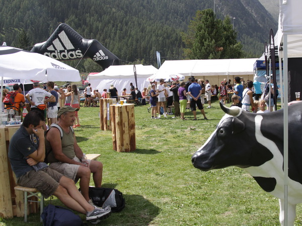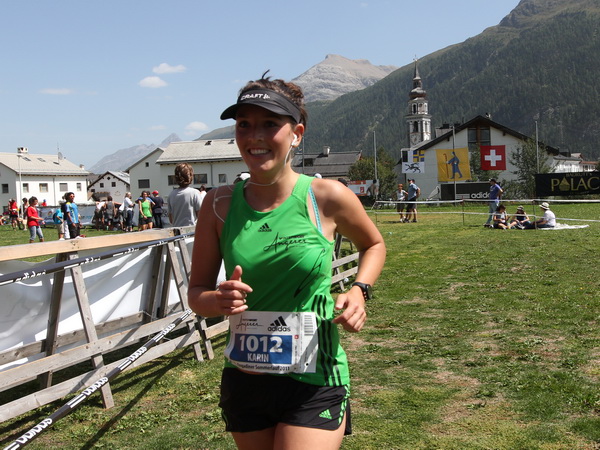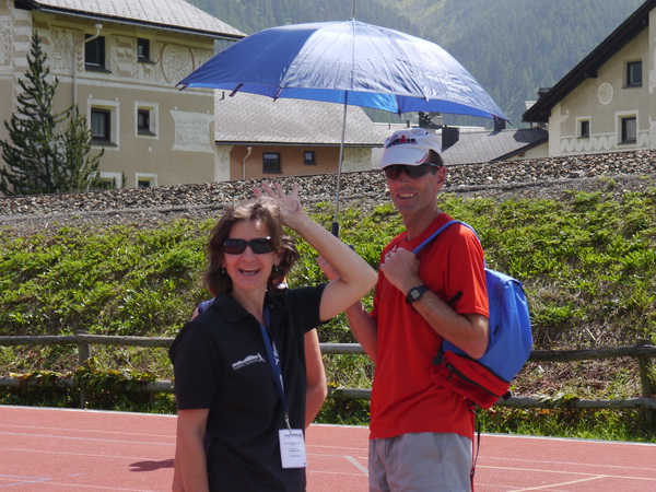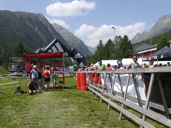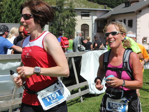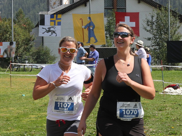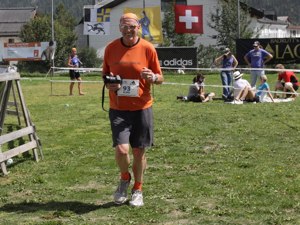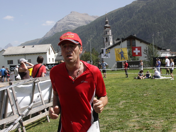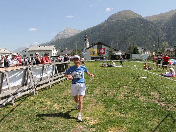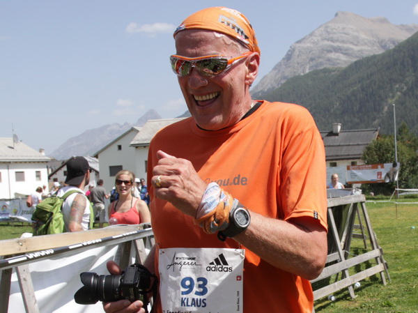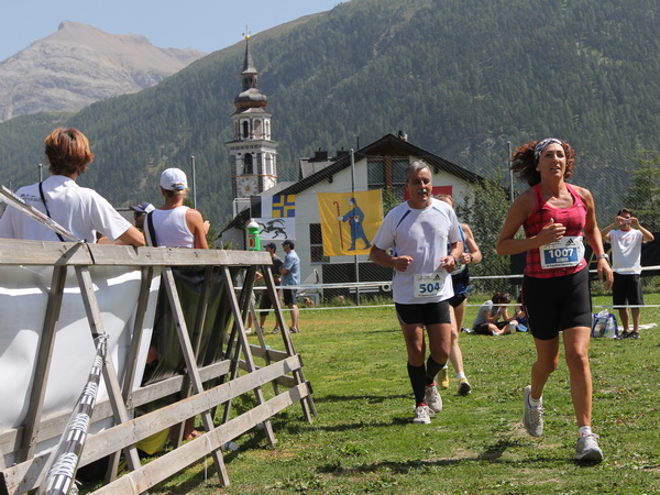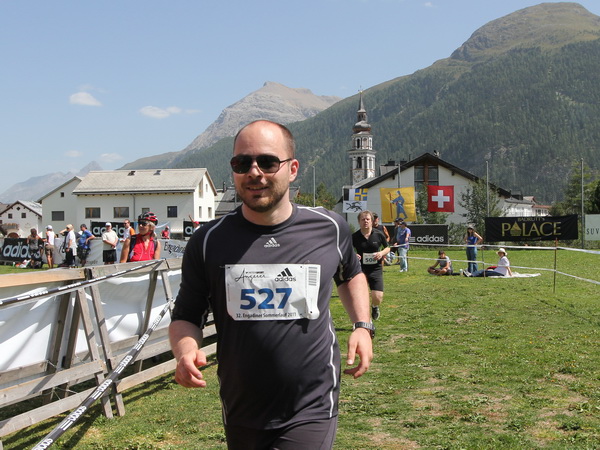 Noch zwei Kilometer. Wir laufen jetzt direkt auf Bever zu, machen aber noch einmal einen kleinen Umweg. Alte Bauernhäuser, tief in die Mauern eingelassene, blumengeschmückte Fenster, enge Gassen. Dann das Ziel bei der Schule. Ein Dorffest für die Läufer und für die Bevölkerung. Links die die Kirche San Giachem (St. Jakobskirche) aus dem 14. Jahrhundert, rechts auf der Wiese der Zielbogen, herzlicher Applaus. Statt einer Medaille gibt es ein nützliches Accessoire von Adidas.