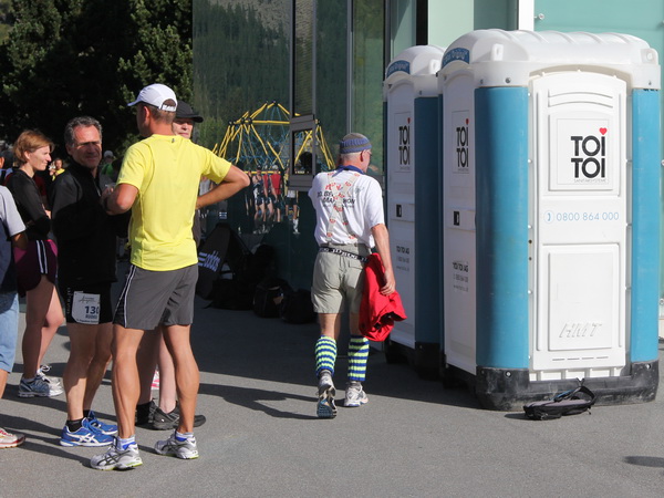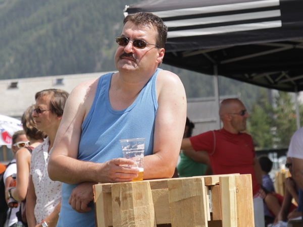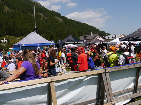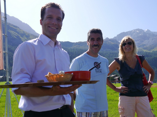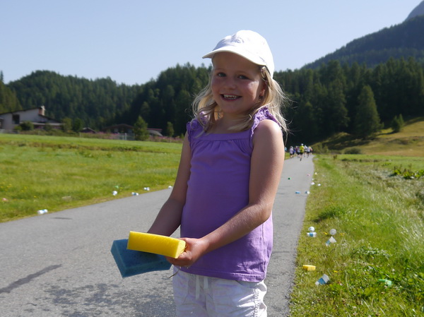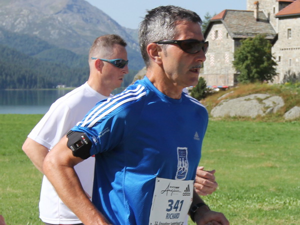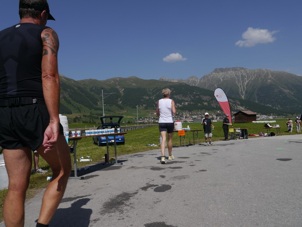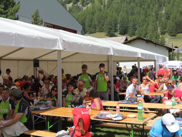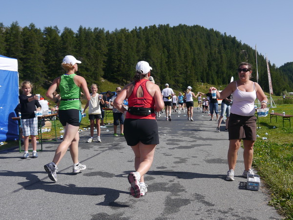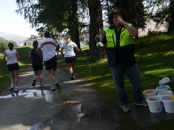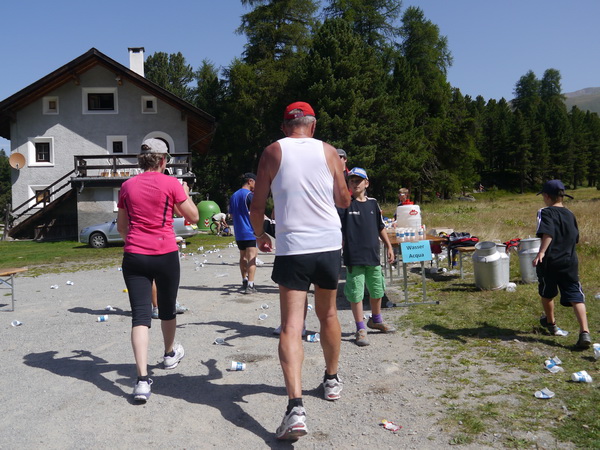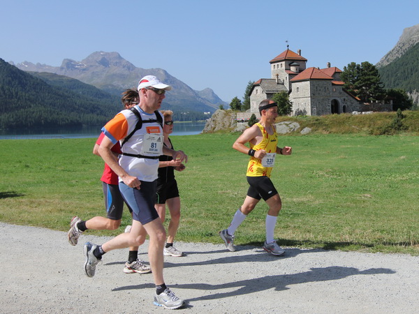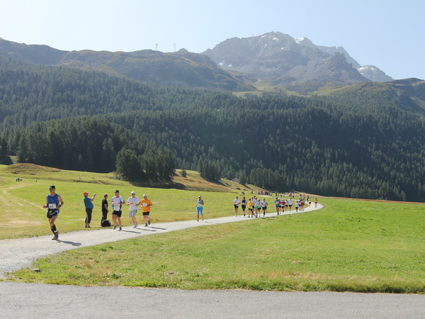 Gegenüber des Sees liegt der Ort Silvaplana, auf unserer Seite Surlej mit der Talstation der Corvatschbahn. Nach gut 5 km sind wir am im 19. Jahrhundert erbauten Schloss Crap da Sass. Gleich erreichen wir die erste Verpflegungsstelle. Verdutzt schaue ich zwei gut gekleidete Passanten an, die mir ein Tablett entgegenhalten. Neugierig schaue ich in die rote Schüssel. Sieht nach Raclette aus und ist es auch. „Kannst Du haben. Der, für den es gedacht ist, ist schon durch.“ Zweifelnd schaue ich ihn an. Warmer Käs‘ und dann noch laufen? Der Mann versteht. „Den hier gibt es hinterher.“ Er hält mir eine Schnapsflasche hin. Ich ergreife die Flucht.