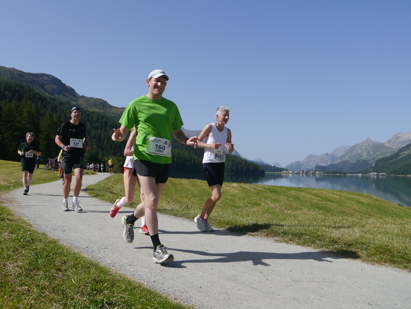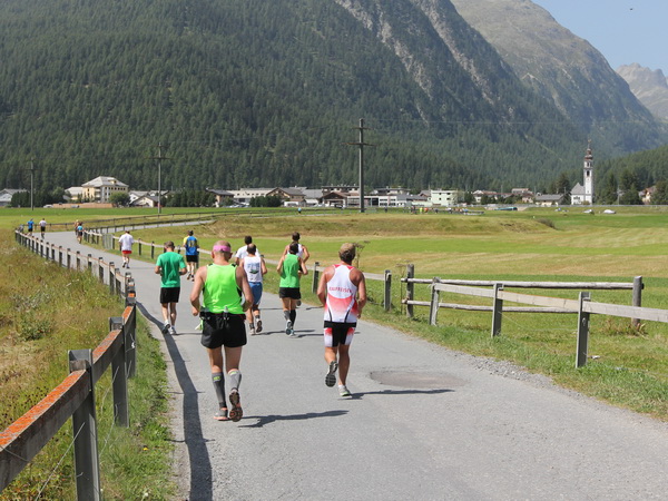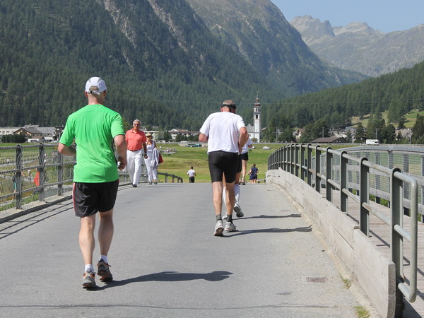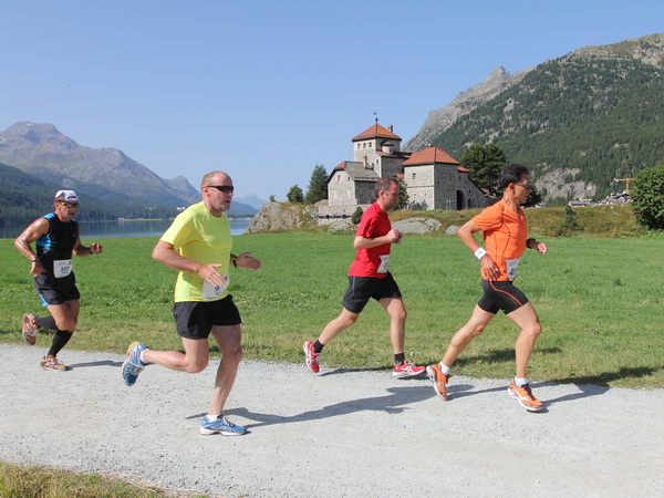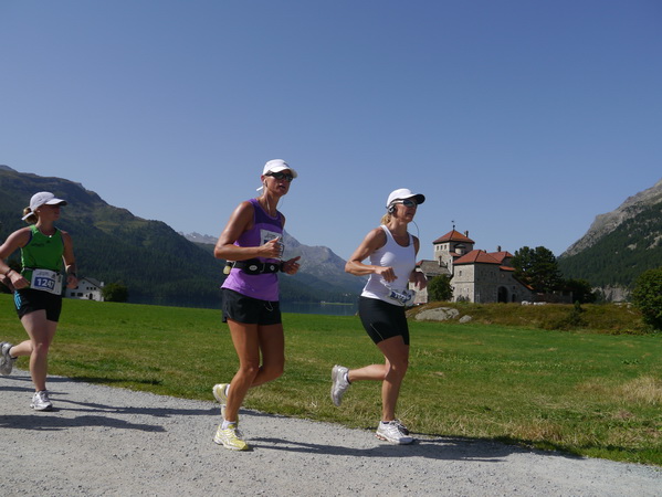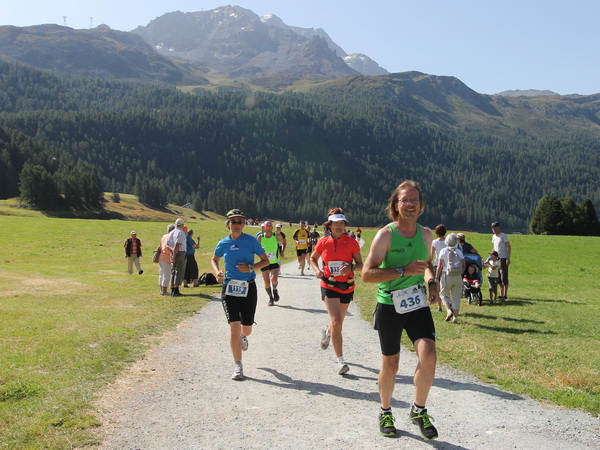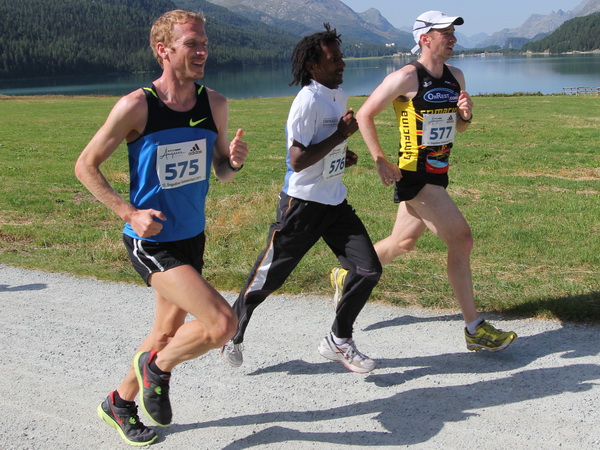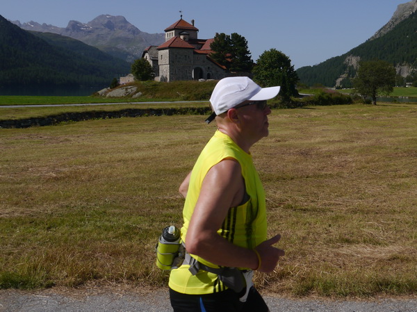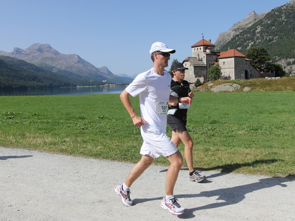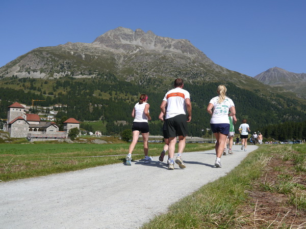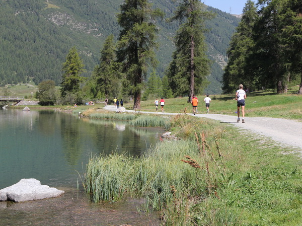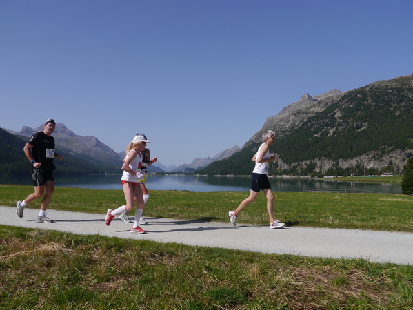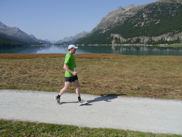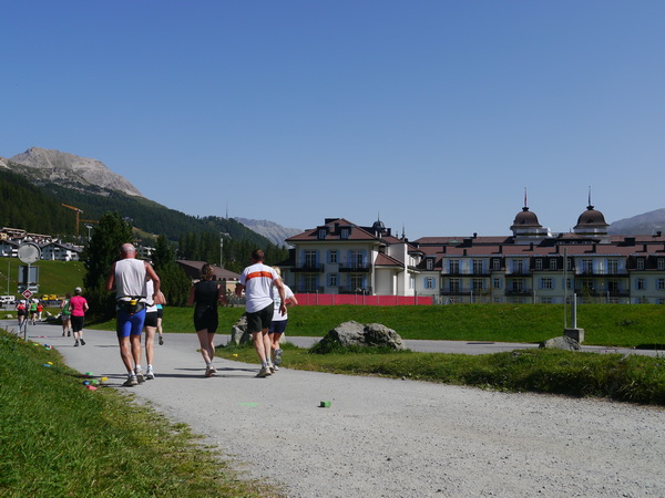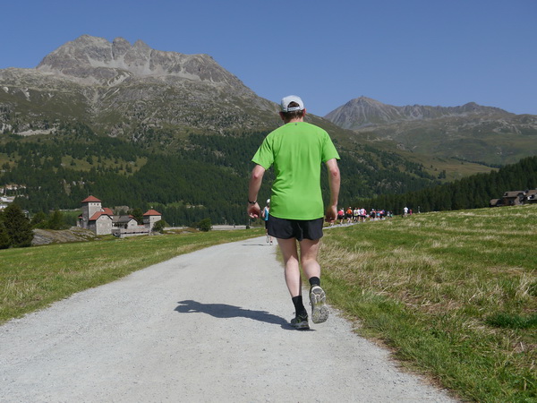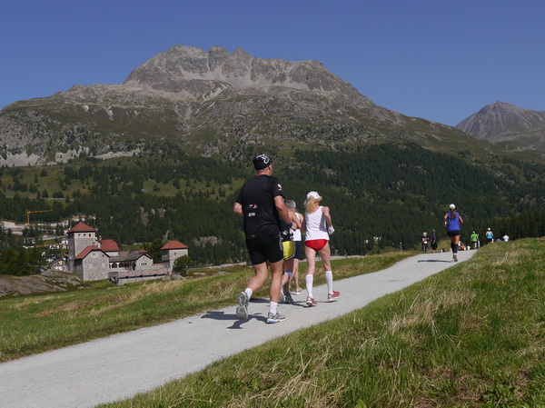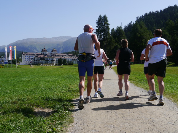 Der Weg ist jetzt ein gutes Stück asphaltiert. An dem kleinen idyllischen See steigt er kurz etwas an, dann geht es eben meist durch schattigen Wald weiter. Genau über den Weg hat eine Festgesellschaft ihr Zelt gebaut. Lautstark bejubelt geht es hindurch und weiter. Wir nähern uns St. Moritz und erkennen schnell die imposante Anlage des Kempinski (km 10). Das 5-Sterne-Hotel gehört zu den Sponsoren des Laufes und macht den Teilnehmern gute Angebote. Auch Herbert Steffny ist mit seinem Laufseminar hier zuhause.