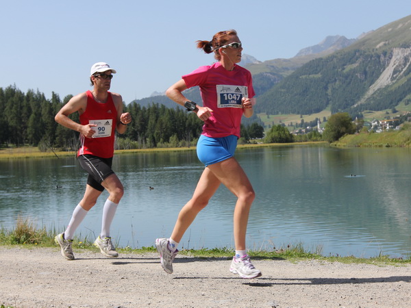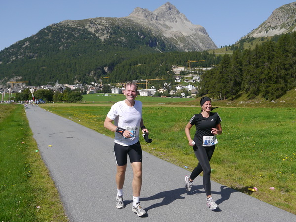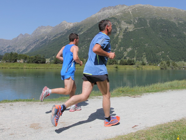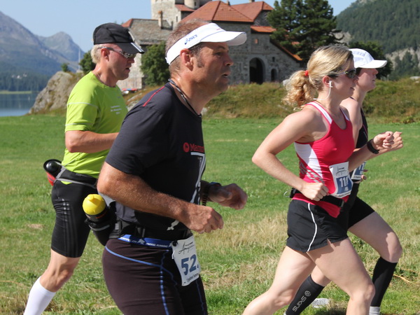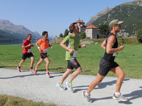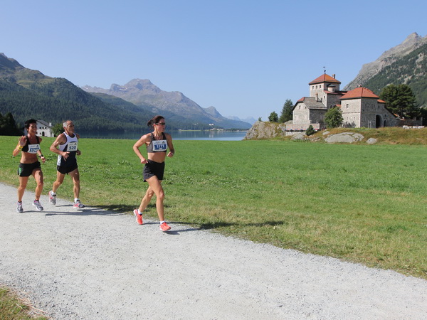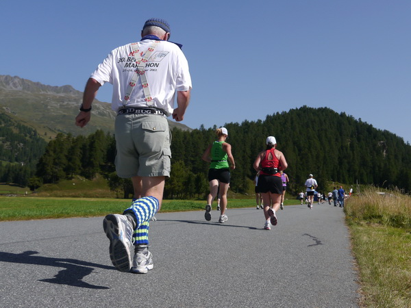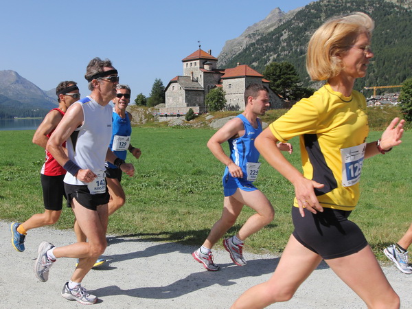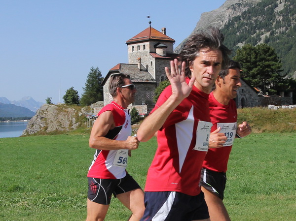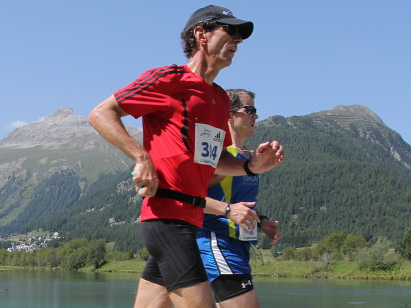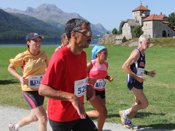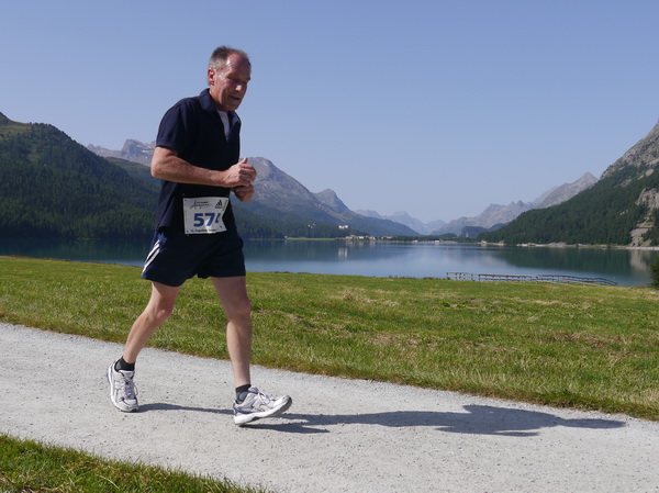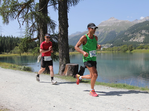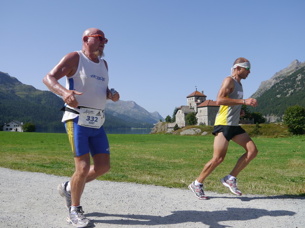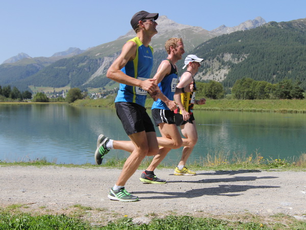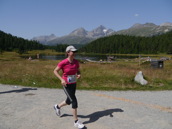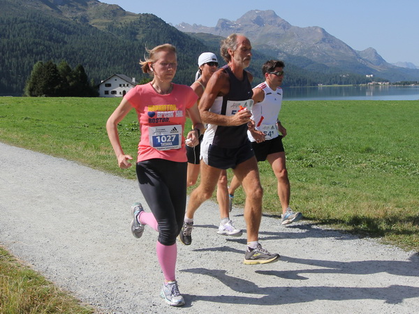 Der Weg ist jetzt ein gutes Stück asphaltiert. An dem kleinen idyllischen See steigt er kurz etwas an, dann geht es eben meist durch schattigen Wald weiter. Genau über den Weg hat eine Festgesellschaft ihr Zelt gebaut. Lautstark bejubelt geht es hindurch und weiter. Wir nähern uns St. Moritz und erkennen schnell die imposante Anlage des Kempinski (km 10). Das 5-Sterne-Hotel gehört zu den Sponsoren des Laufes und macht den Teilnehmern gute Angebote. Auch Herbert Steffny ist mit seinem Laufseminar hier zuhause.