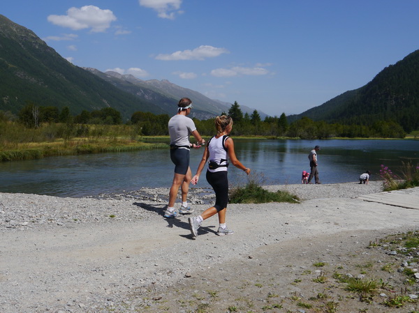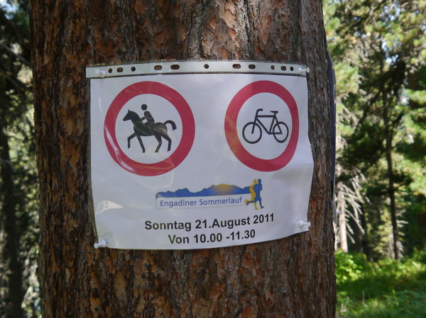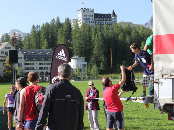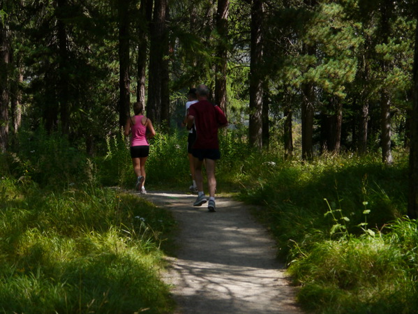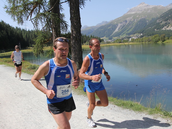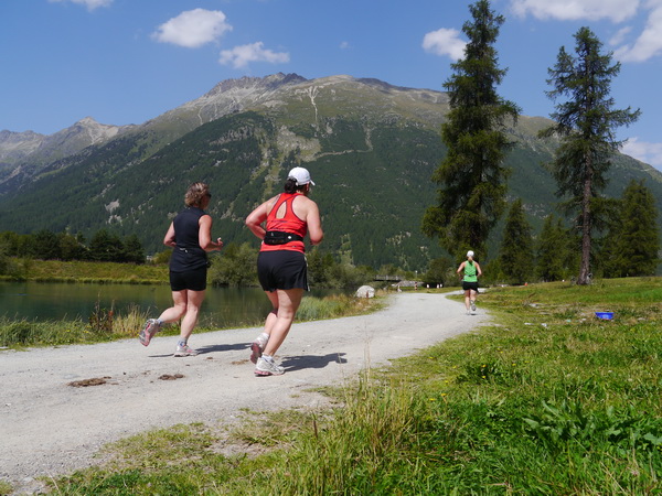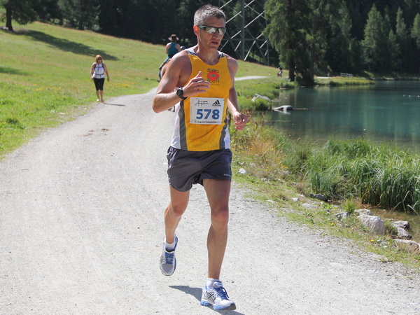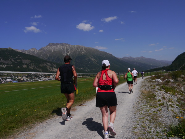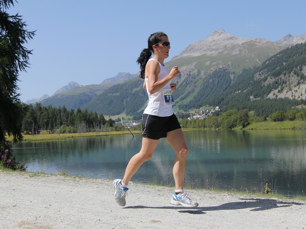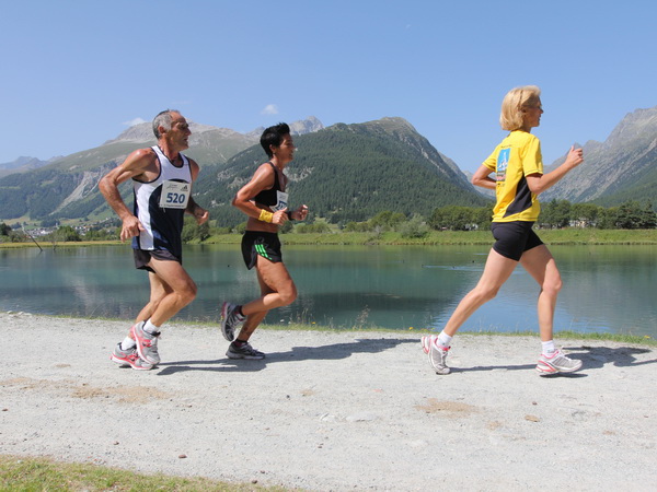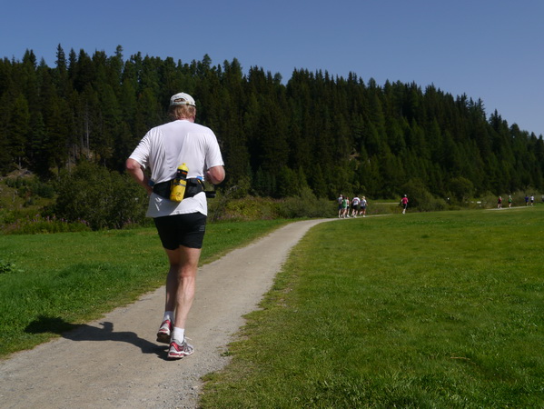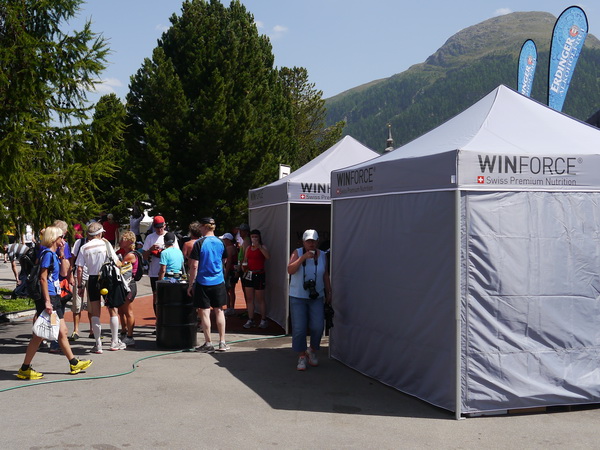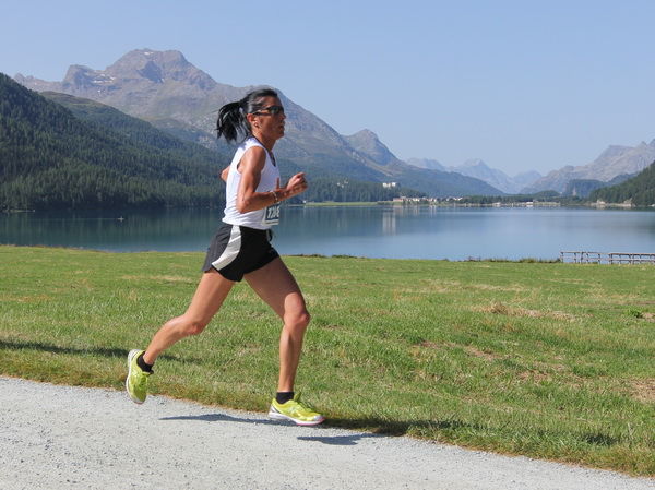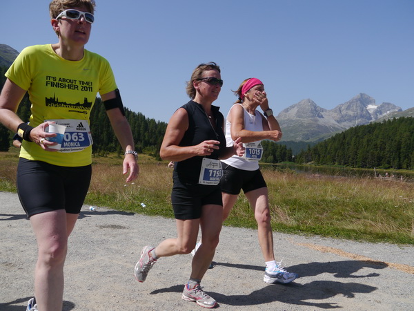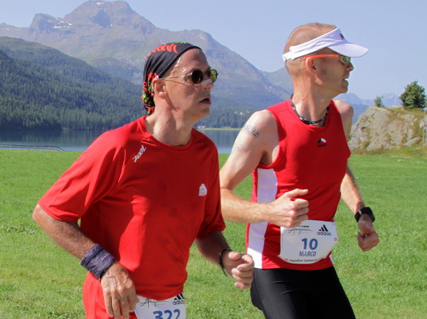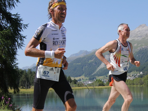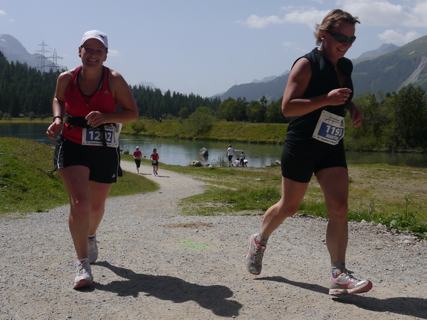 Der Weg ist jetzt ein gutes Stück asphaltiert. An dem kleinen idyllischen See steigt er kurz etwas an, dann geht es eben meist durch schattigen Wald weiter. Genau über den Weg hat eine Festgesellschaft ihr Zelt gebaut. Lautstark bejubelt geht es hindurch und weiter. Wir nähern uns St. Moritz und erkennen schnell die imposante Anlage des Kempinski (km 10). Das 5-Sterne-Hotel gehört zu den Sponsoren des Laufes und macht den Teilnehmern gute Angebote. Auch Herbert Steffny ist mit seinem Laufseminar hier zuhause.
