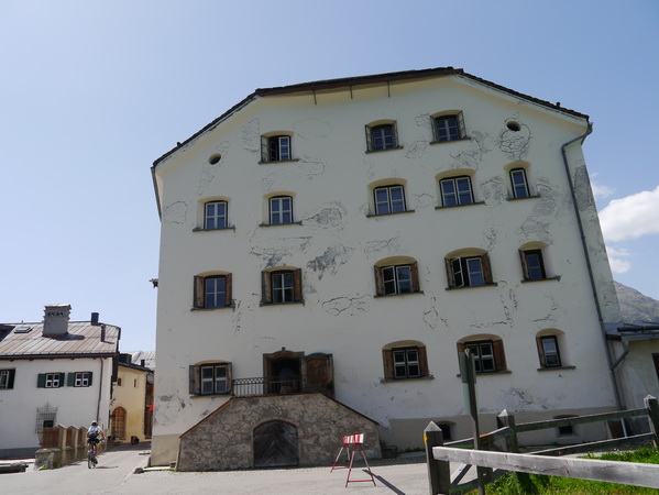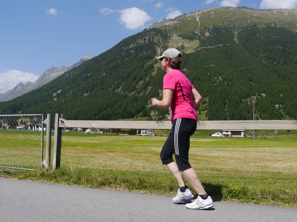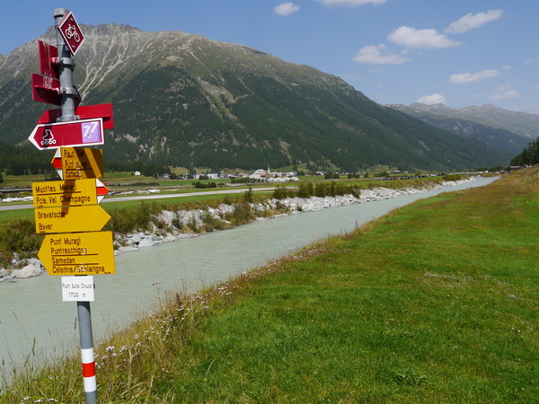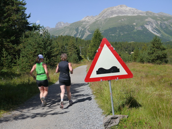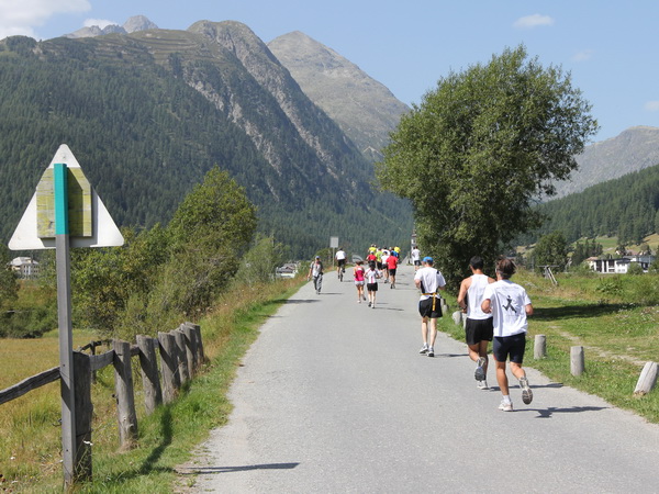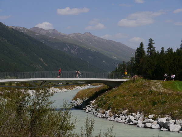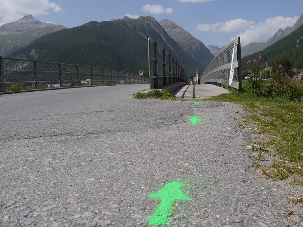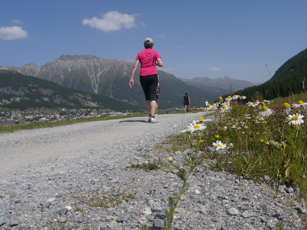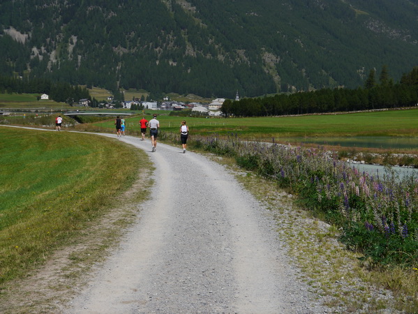 Richtung Pontresina (km 18) führt uns ein abschüssiger Weg durch freies Feld. Pontresina ist Zentrum des Nordischen Skisports. Früher gab es auch Alpine Wettkämpfe, zuletzt 2003, als in St. Moritz die Ski-WM ausgetragen wurde. Im Ort gibt es viele alte Häuser im typischen Engadiner Stil, mit Erkern, Gittern und Malereien. Sehenswert ist auch die Kirche StaMaria aus dem 12. Jahrhundert. Und natürlich gibt es viele erstklassige und noble Hotels und Restaurants. In den Ort kommen wir nicht. Wir laufen parallel zur Verkehrsstraße, auf der man in Gegenrichtung über den Berninapass (2328 m) ins italienische Veltlin kommt.