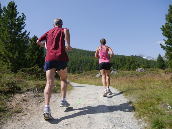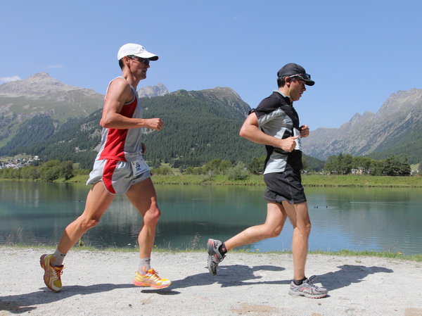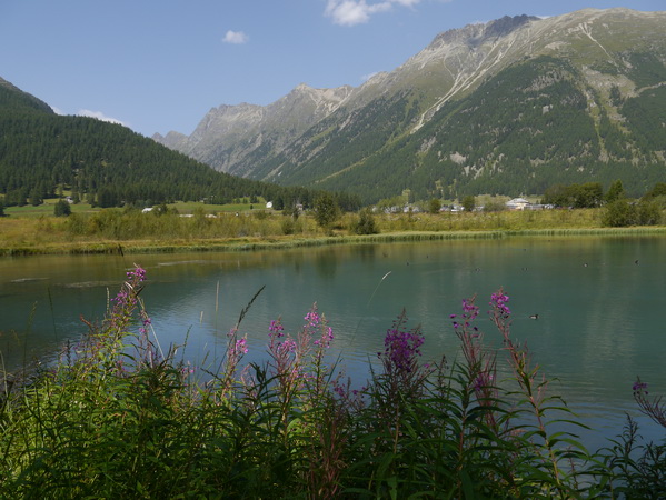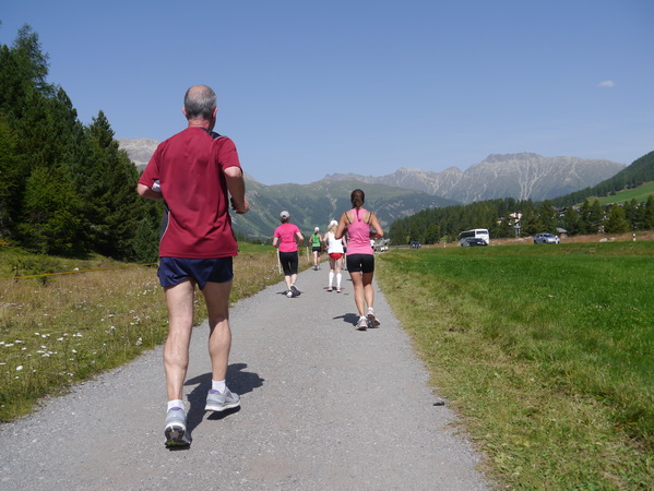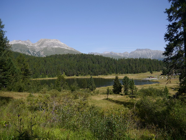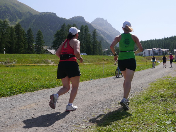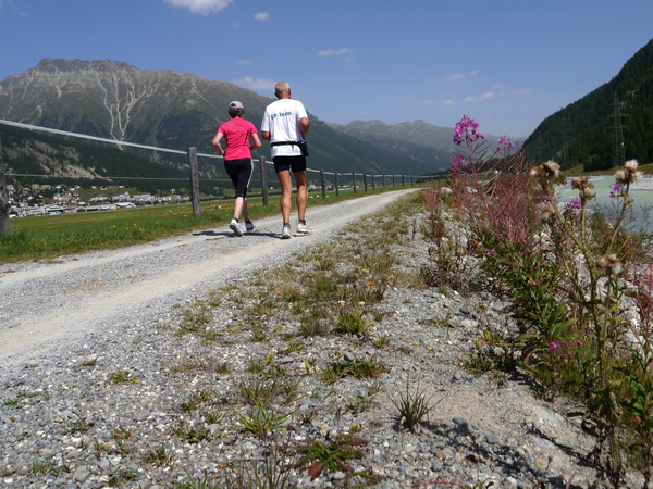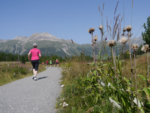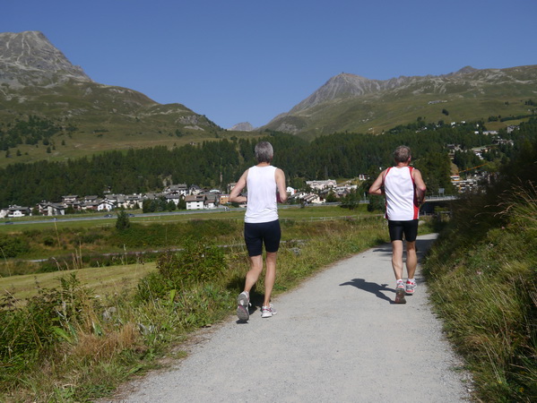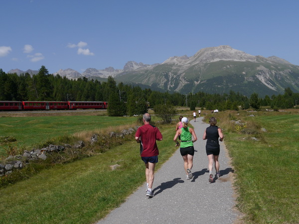Das mondäne St. Moritz-Dorf liegt am steilen Nordufer des St. Moritzersees. Wir sind am Südufer in St. Moritz-Bad, wo sich neben dem Heilbad auch die Sportanlagen befinden. Von hier kann man ideal zu ausgedehnten Läufen auf völlig ebenen Wegen um den See starten.
