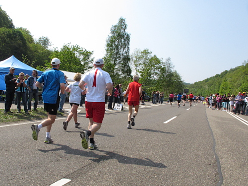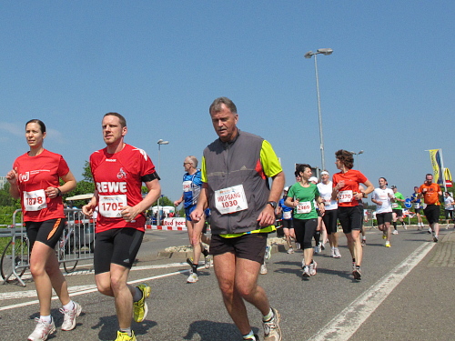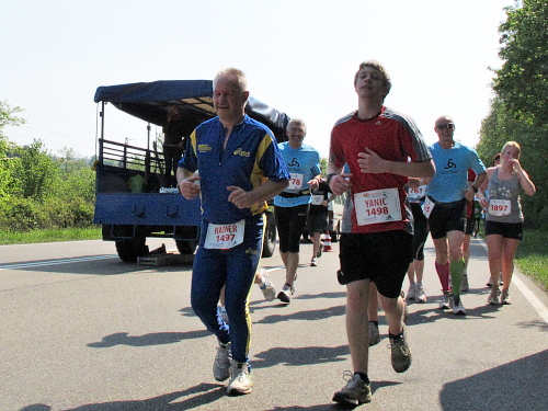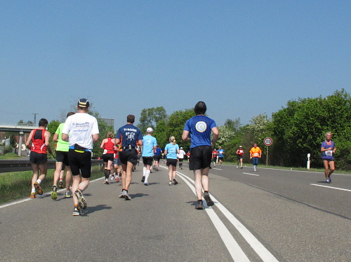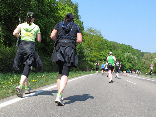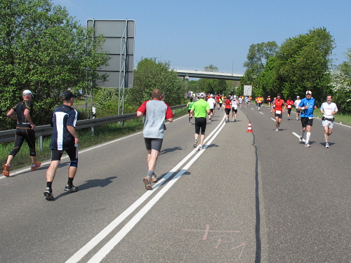 „Wenn Du noch einmal überholst, kriege ich ´ne Depression,“ fürchtet ein Läufer. Stimmt, manchen Läufer überhole ich wegen meiner Fotostopps alle 10 Minuten. Dann kommt die Wende. Das ganze zurück. Zwei Mädels fallen mir auf. Sie laufen absolut synchron, als ob sie das geübt haben. „Jeder macht halt das, was er gut kann. Wir machen das. Halbmarathon laufen können wir nicht so gut“, bekomme ich auf Anfrage mitgeteilt. Tiefstaplerinnen? Sieht doch ganz locker aus. Eine Stunde später die zweite Begegnung. Sie, Kilometer zurück, zwar immer noch zusammen, aber nicht mehr im Gleichschritt und auch nicht mehr am Laufen. Nur noch müde am Gehen.