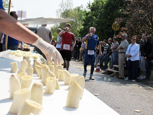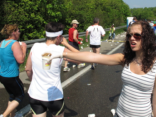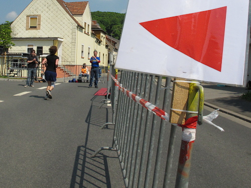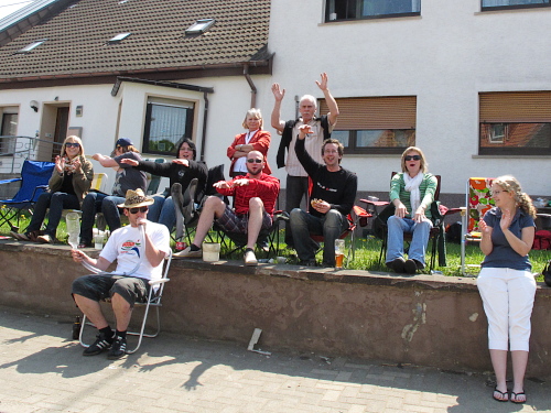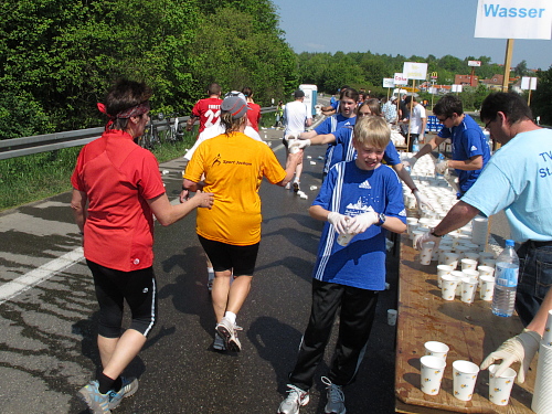 Apropos: Die Verpflegung ist hervorragend. Wasser gibt’s für innen und außen, außerdem Iso und Cola, Äpfel, Bananen und Melonen. Nach mehr hab ich nicht geschaut. Präsentiert werden Speis und Trank von gutgelaunten Helferinnen und Helfern, die sich wohl sagen: „Hauptsach dabei gewen.“